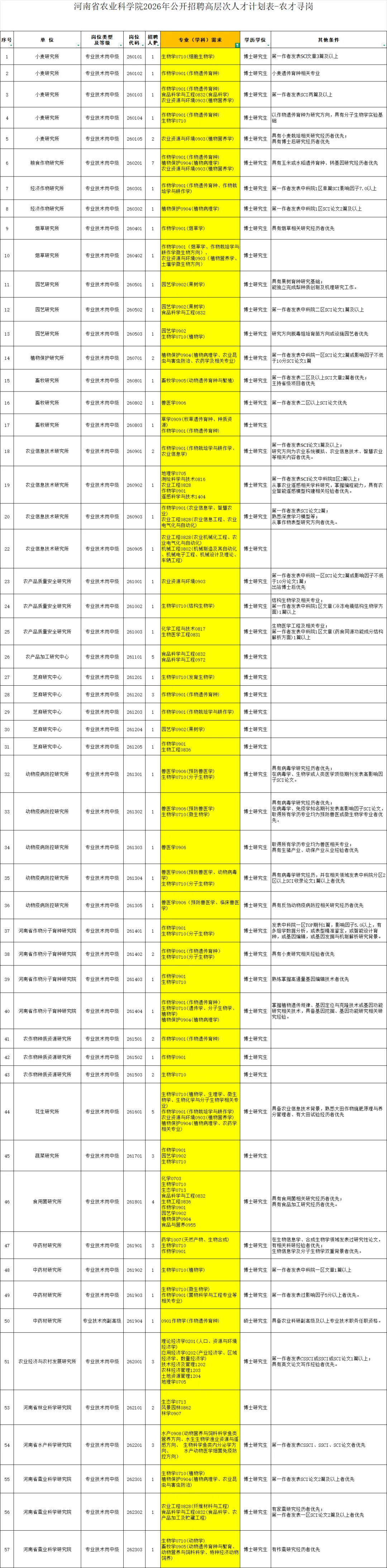 河南省农业科学院2026年公开招聘高层次人才计划表