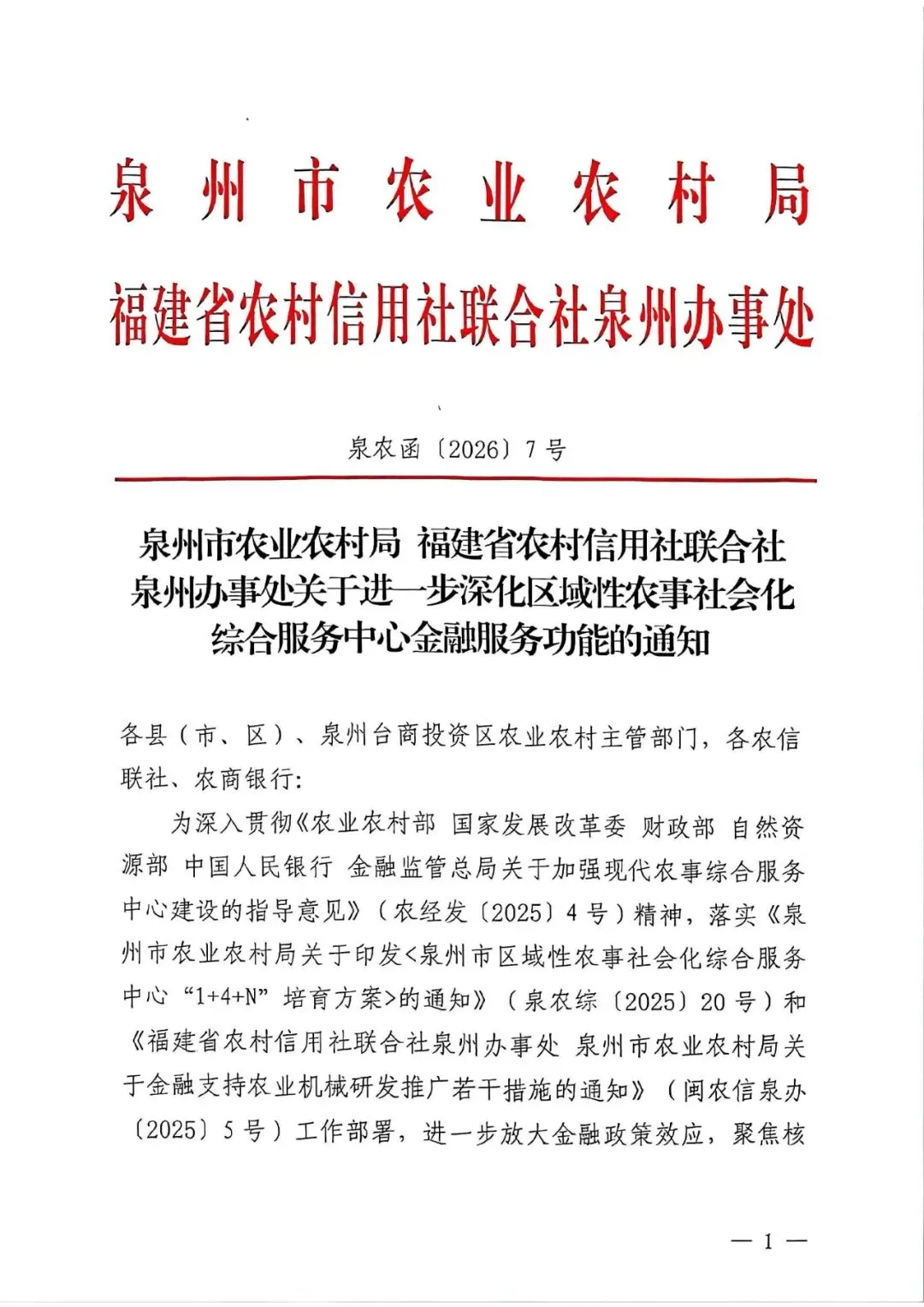省农信联社泉州办事处与泉州市农业农村局深化政银联动,联合下发《关于进一步深化区域性农事社会化综合服务中心金融服务功能的通知》,进一步放大金融支农政策效应,协同构建现代农事综合服务“四个一”模式并全面落地,推动小农户与现代农业高效衔接。