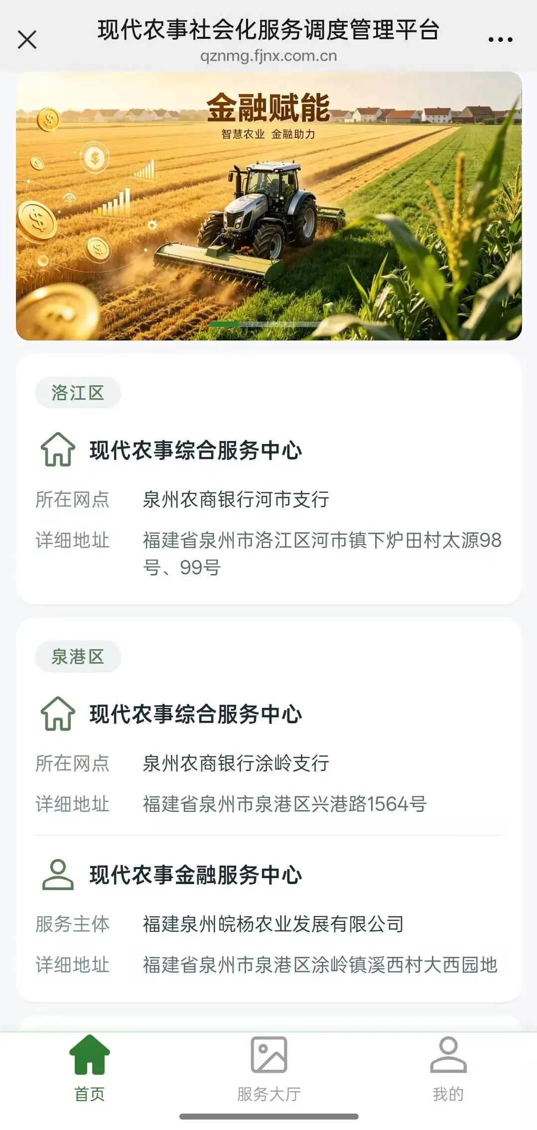 为深入落实六部委关于加强现代农事综合服务中心建设部署,进一步推进区域性便捷高效农事社会化综合服务体系建设,打造高能级农事社会化服务平台,提升联农带农益农服务能力,日前,省农信联社泉州办事处联合泉州市农业农村局,推动辖内行社与各涉农县(市、区)农业农村部门共同建设10个区域“现代农事综合服务中心”和9个区域“现代农事金融服务中心”,并上线“现代农事社会化服务调度管理平台”,实现全市现代农事社会化综合服务线上线下全覆盖!