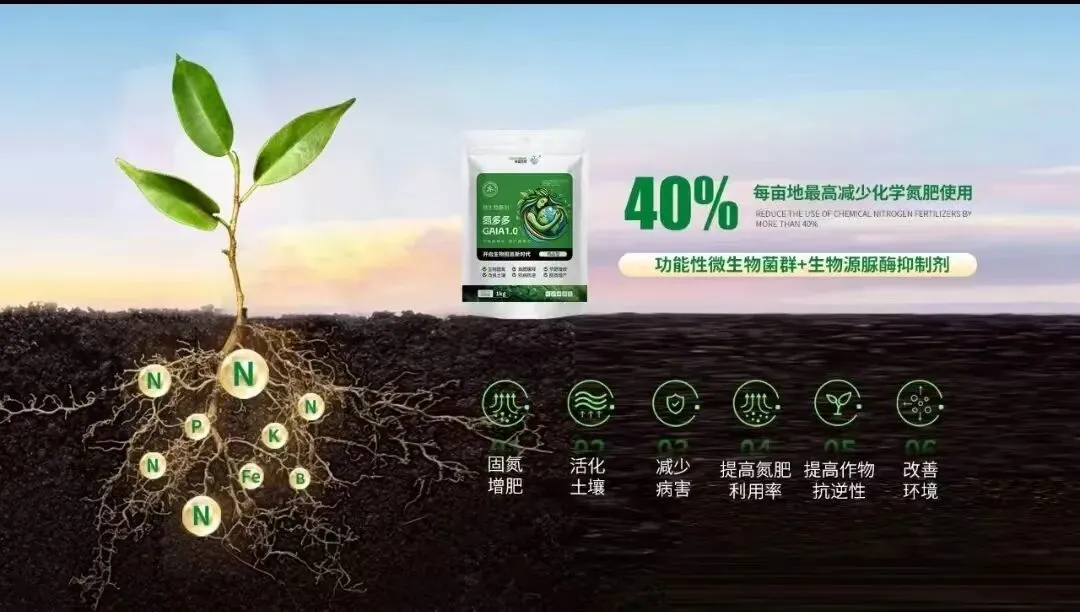 氮多多特别添加生物脲酶抑制剂,能有效延缓尿素分解,大幅提升氮肥利用率,让肥料养分被作物充分吸收,将氮肥利用率从35%提升至60%以上。