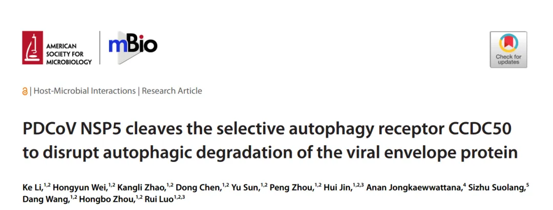 IF:5.1 中科院1区 | JCR/Q1 微生物学 参考译文:PDCoV NSP5切割选择性自噬受体CCDC 50以破坏病毒包膜蛋白的自噬降解 第一作者:Ke Li 通讯作者:Rui Luo |