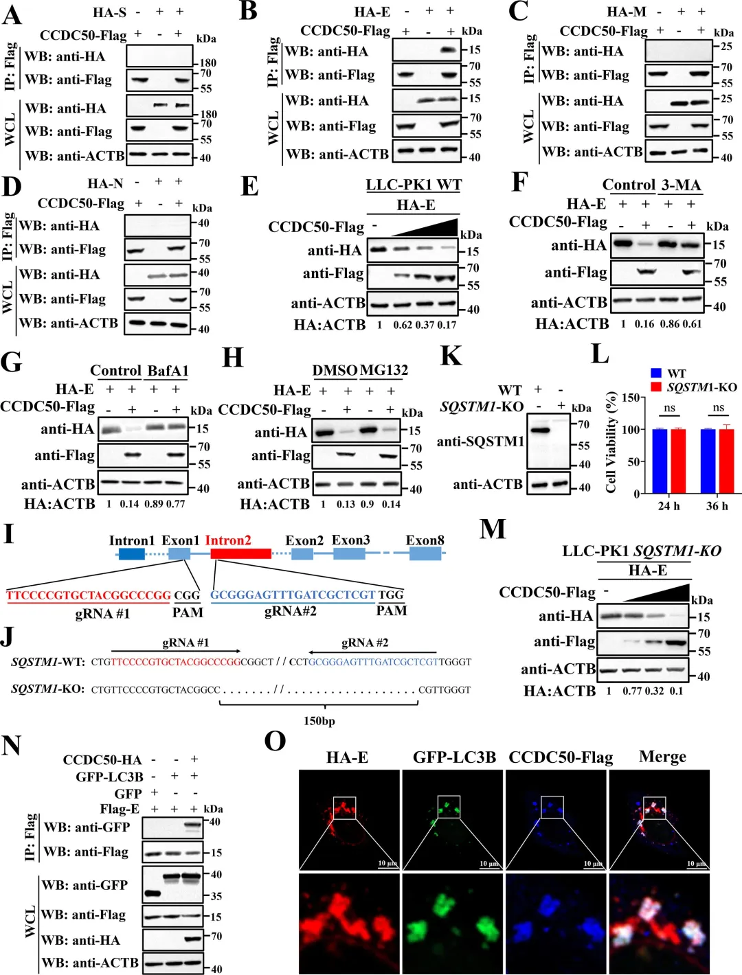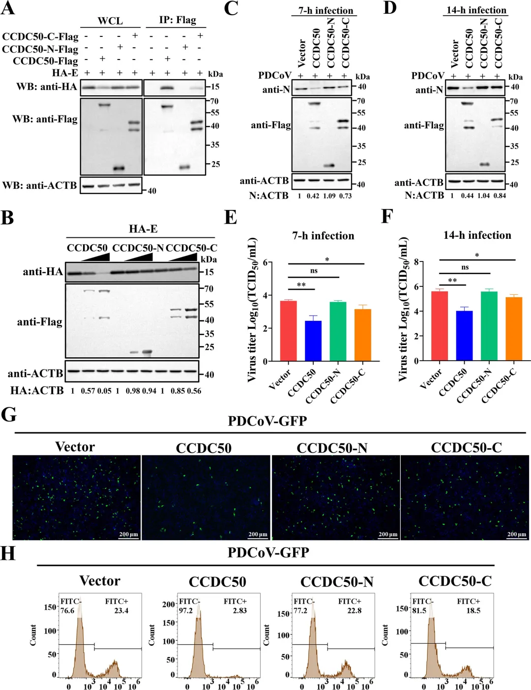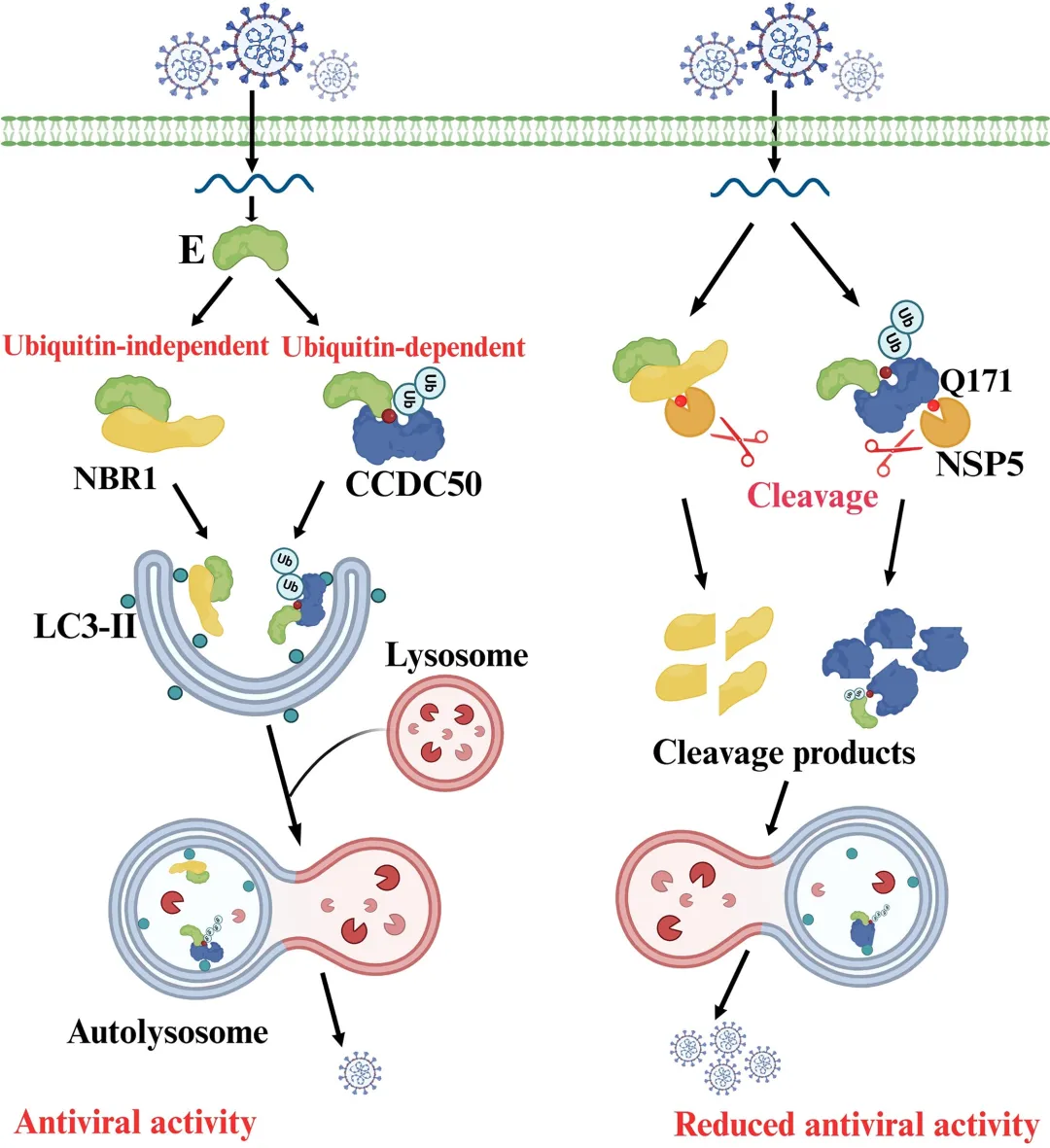 与此同时,PDCoV演化出精密的免疫逃逸策略。病毒的NSP5蛋白酶通过其水解酶活性,在CCDC50蛋白的Q171位点对其进行特异性切割,产生N端和C端两个片段。切割后的CCDC50-N完全丧失与泛素、LC3B及E蛋白的结合能力,CCDC50-C虽保留部分互作但功能显著减弱,导致CCDC50介导的选择性自噬降解功能受损,抗病毒活性大幅下降。