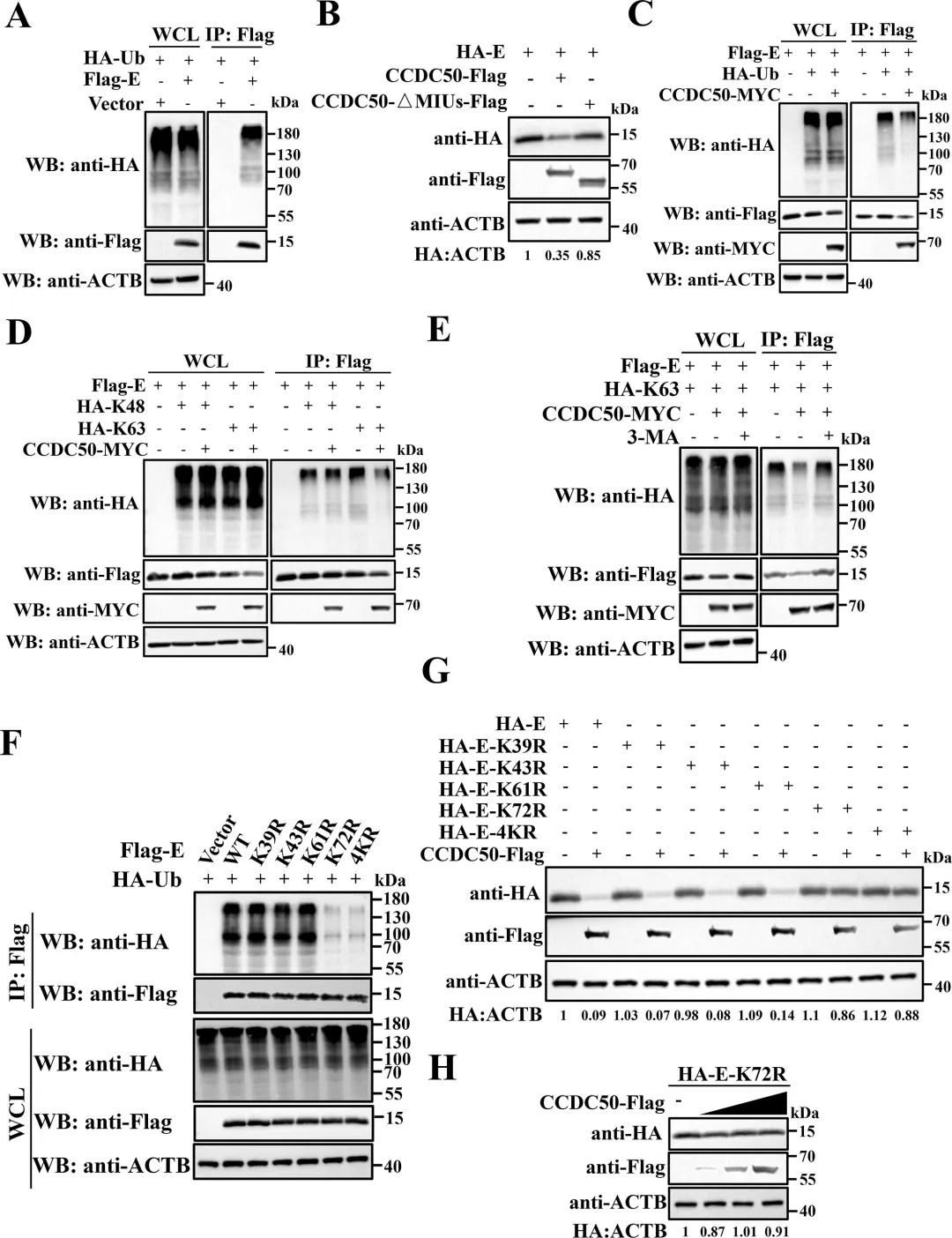 免疫共沉淀结果显示,全长CCDC50可与PDCoV E蛋白高效结合;CCDC50-N端片段完全丧失与E蛋白的结合能力;而CCDC50-C端片段虽保留微弱互作,但结合效率较全长显著降低。功能实验进一步表明,在LLC-PK1细胞中过表达全长CCDC50可呈剂量依赖性降低E蛋白水平,并有效抑制病毒N蛋白表达及病毒滴度;CCDC50-N完全丧失上述抑制作用;CCDC50-C仅表现出部分抑制效果。利用PDCoV-GFP报告病毒进行的荧光显微镜及流式细胞术分析进一步证实,全长CCDC50显著减少病毒感染比例,而CCDC50-N无抑制作用,CCDC50-C的抑制效果亦明显减弱。本研究首次揭示CCDC50作为一种新型选择性自噬受体,在猪丁型冠状病毒(PDCoV)感染中发挥重要的抗病毒作用。机制研究表明,CCDC50通过其MIU结构域特异性识别E蛋白K72位点的K63连接多聚泛素化修饰,并与LC3B相互作用,将病毒E蛋白靶向自噬-溶酶体途径进行降解,从而限制病毒复制。这一过程独立于经典自噬受体SQSTM1/p62和NBR1,揭示了宿主抗冠状病毒防御的新机制。