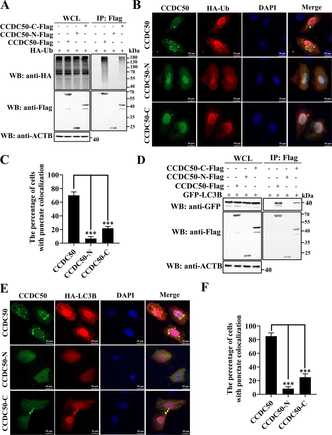通过共表达实验发现,PDCoV的NSP5蛋白酶可诱导CCDC50产生与病毒感染时大小一致的C端切割片段,而催化失活的NSP5突变体则无此作用,表明切割依赖NSP5的蛋白酶活性。利用双标签构建体,研究者明确了切割产生约20 kDa的N端片段和约45 kDa的C端片段。结合冠状病毒NSP5切割底物需在P1位点为谷氨酰胺(Q)的特异性,研究者对CCDC50上多个候选Q残基进行点突变,结果显示仅Q171A突变可完全阻断NSP5介导的切割以及PDCoV感染诱导的切割,确定Q171为关键切割位点。图2.PDCoV NSP 5通过其蛋白酶活性在Q171处切割CCDC 50研究者通过过表达和基因敲除两方面验证了CCDC50对PDCoV复制的调控作用。过表达野生型CCDC50可显著降低PDCoV N蛋白表达水平及病毒滴度,而切割抗性突变体CCDC50𝑄171𝐴Q171A的抑制效果更强,表明NSP5介导的切割削弱了CCDC50的抗病毒功能。利用PDCoV-GFP报告病毒,荧光显微镜和流式细胞术进一步证实CCDC50过表达可减少病毒感染比例和荧光强度。相反,通过CRISPR-Cas9构建的CCDC50敲除细胞系中,PDCoV N蛋白积累、病毒滴度和GFP阳性细胞比例均显著升高,且细胞活力未受敲除影响。通过免疫共沉淀实验发现,CCDC50特异性结合PDCoV的E蛋白,而与S、M、N蛋白无显著互作。在LLC-PK1细胞中过表达CCDC50可呈剂量依赖性地降低E蛋白水平,且该降解作用可被自噬抑制剂3-甲基腺嘌呤和巴弗洛霉素A1阻断,但不受蛋白酶体抑制剂MG132影响,表明CCDC50通过自噬-溶酶体途径介导E蛋白降解。为明确CCDC50是否依赖经典自噬受体,研究者构建了SQSTM1/p62敲除细胞系,结果显示CCDC50仍能有效降低E蛋白水平,表明其功能独立于SQSTM1。进一步在NBR1/CCDC50双敲除细胞中回补实验表明,CCDC50与NBR1分别以相互独立的方式介导E蛋白降解。此外,CCDC50过表达可增强E蛋白与LC3B的互作及共定位,提示其作为桥接分子将E蛋白招募至自噬体。图4.CCDC 50与PDCoV E相互作用并介导其自噬降解5.CCDC50识别PDCoV E蛋白的K63连接的泛素化研究者探究了CCDC50识别E蛋白的分子基础。由于CCDC50通过其MIU结构域结合泛素,研究者首先验证了E蛋白存在泛素化修饰,并发现缺失MIU结构域的CCDC50突变体无法降解E蛋白,表明泛素结合能力是其介导降解的前提。进一步实验显示,CCDC50过表达可降低E蛋白的K63连接泛素化水平,但对K48连接泛素化无显著影响,且该效应可被自噬抑制剂3-甲基腺嘌呤阻断,提示CCDC50选择性地识别K63泛素化修饰并通过自噬途径清除底物。为精确定位E蛋白上的泛素化位点,研究者构建了多个赖氨酸突变为精氨酸的点突变体,发现K72R突变及四个赖氨酸位点联合突变(4KR)均显著削弱E蛋白的泛素化水平。图5.CCDC50识别PDCoV E蛋白的K63连接的泛素化6.NSP5介导的CCDC50切割损害其选择性自噬功能研究者探讨了切割对CCDC50作为自噬受体功能的影响。通过免疫共沉淀实验发现,全长CCDC50能够与泛素及LC3B发生强效结合;而N端切割片段(CCDC50-N)由于缺失MIU和LIR结构域,完全丧失了与泛素和LC3B的相互作用;C端切割片段(CCDC50-C)虽保留了MIU结构域,但其结合能力较全长蛋白显著减弱。免疫荧光共定位分析进一步证实,全长CCDC50与泛素及LC3B呈现明显的点状共定位,而CCDC50-N几乎无共定位,CCDC50-C的共定位程度亦明显降低。这些结果表明,NSP5介导的切割破坏了CCDC50的模块化结构,使其无法同时有效结合泛素化底物和自噬体膜蛋白LC3B,从而削弱了其作为选择性自噬受体的货物递送功能。图6.CCDC50的裂解削弱了其在选择性自噬中的功能7.NSP5介导的切割片段减弱CCDC 50抗病毒活性