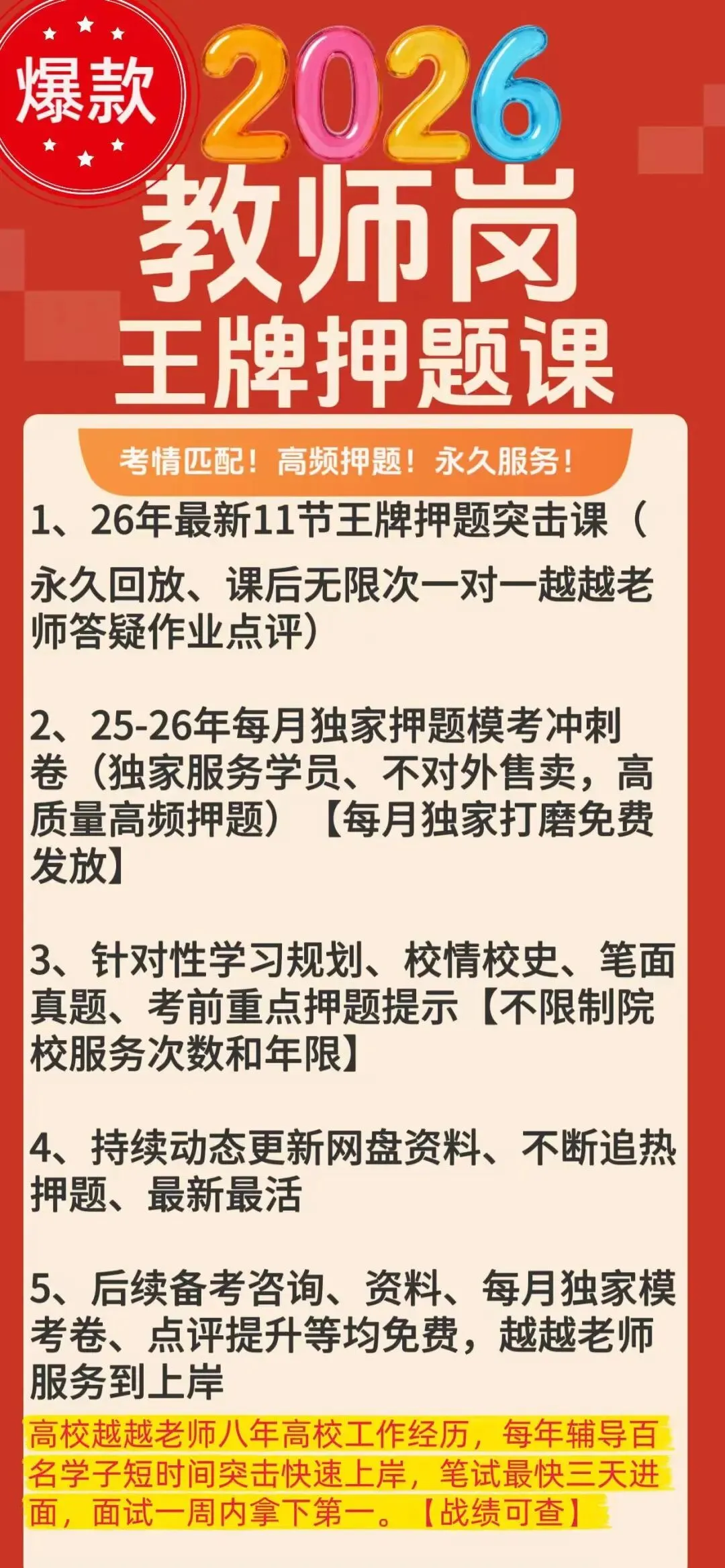 深入研究江苏考情特色,高校越越老师亲自全程一对一带,匹配最新王牌押题突击课、搭配25年、26年最新研磨15套模考冲刺卷和专属重点提示与特色押题话题,笔面冲刺一站式上岸不是问题!!越越向你承诺:
