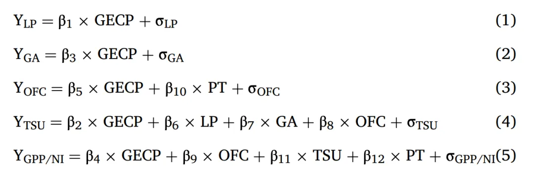 在这些方程中,GECP、LP、GA、OFC、TSU、GPP、PT 和 NI 分别代表草地生态补偿政策、牲畜价格、草地面积、运营和饲养成本、总绵羊单位、总初级生产力、降水量和温度,以及牧民家庭的净收入(表A.1)。β 是回归系数,σ 是测量误差,下标对应假设的路径。这五个方程相互关联,推断是同时进行的,而不是五个独立的回归方程。GECP对GPP或NI的总影响是变量对结果的直接和间接效应之和,如(4)、(5)所示。最后,我们评估拟合优度指数,确保其超过0.36,以确认模型表现良好。为测试PLSPMM识别的关键通路的稳健性,我们补充了固定效应面板回归模型。如果固定效应估计值具有统计显著性(P < 0.05)且方向性一致,则该关系被视为稳健。