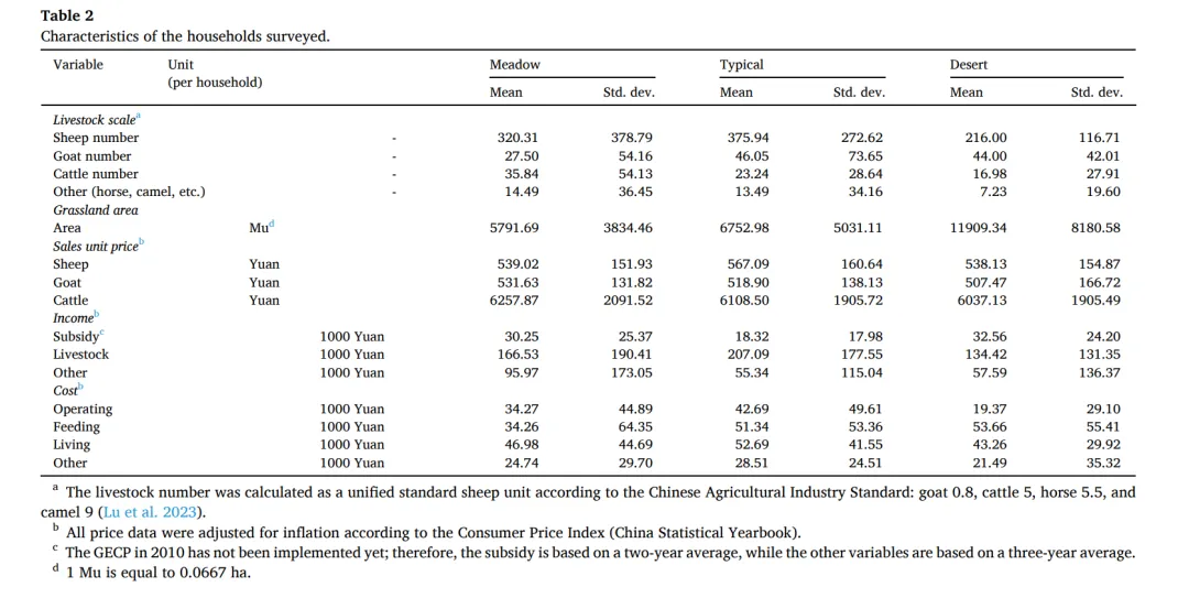 问卷收集了家庭生产和社会经济特征的信息,包括畜牧规模、销售价格、牧民收入和成本。收入主要来自补贴(保单补偿)、畜牧业(牲畜及副产品销售)及其他来源(兼职工作、股息、保险、存款利息等)。成本包括运营(雇佣劳动力、租赁牧场及畜牧业中的汽油和柴油费用)、饲养(饲料)、生活费(日常生活包括吃饭、衣物、教育和医疗等)及其他成本(现金赠与、利息支付等)。(见表2,表A.1)。具体来说,典型草原家庭的平均繁殖规模最大,其次是草地草原和沙漠草原。相比之下,沙漠草原的家庭平均草地面积最高,其次是典型草原和草地草原。在经济指标方面,畜牧业的单价在草地中最高,其次是典型草原和沙漠草原。此外,沙漠草原家庭获得的平均补贴收入最高,相较于草地和典型草原。按总收入计算,草地排名第一,其次是典型草原和沙漠草原。最后,运营和饲养成本在典型草原中最高,草原和沙漠草原按递减顺序排列(见表2)。