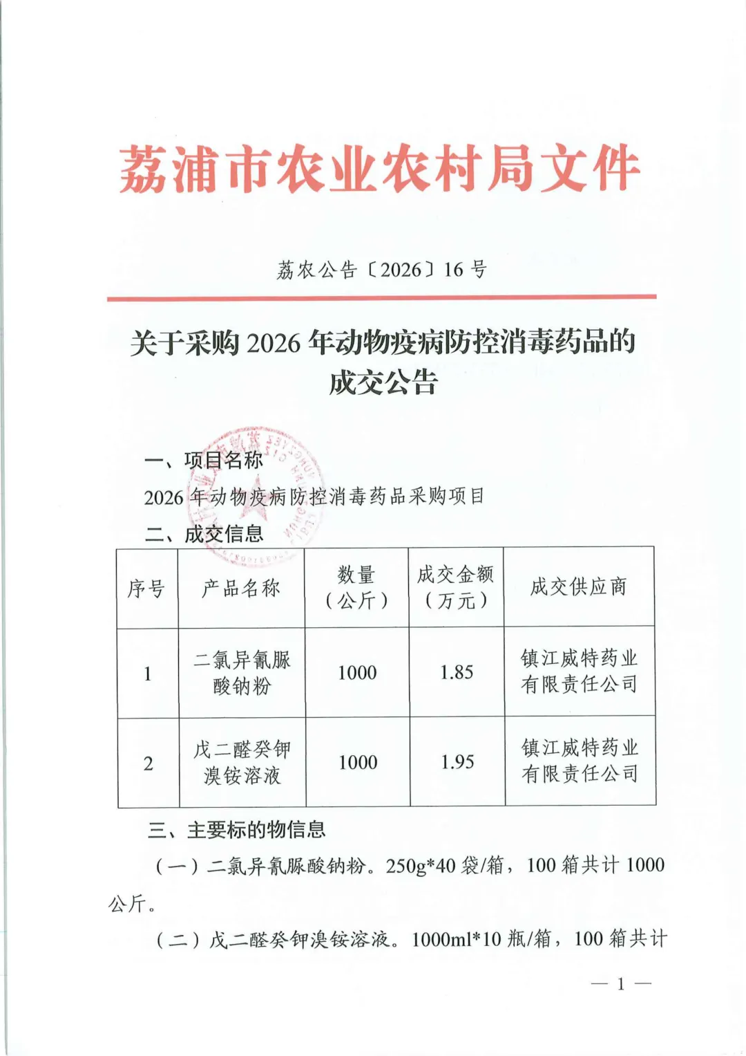 >荔浦市农业农村局关于采购2026年动物疫病防控消毒药品的成交公告
