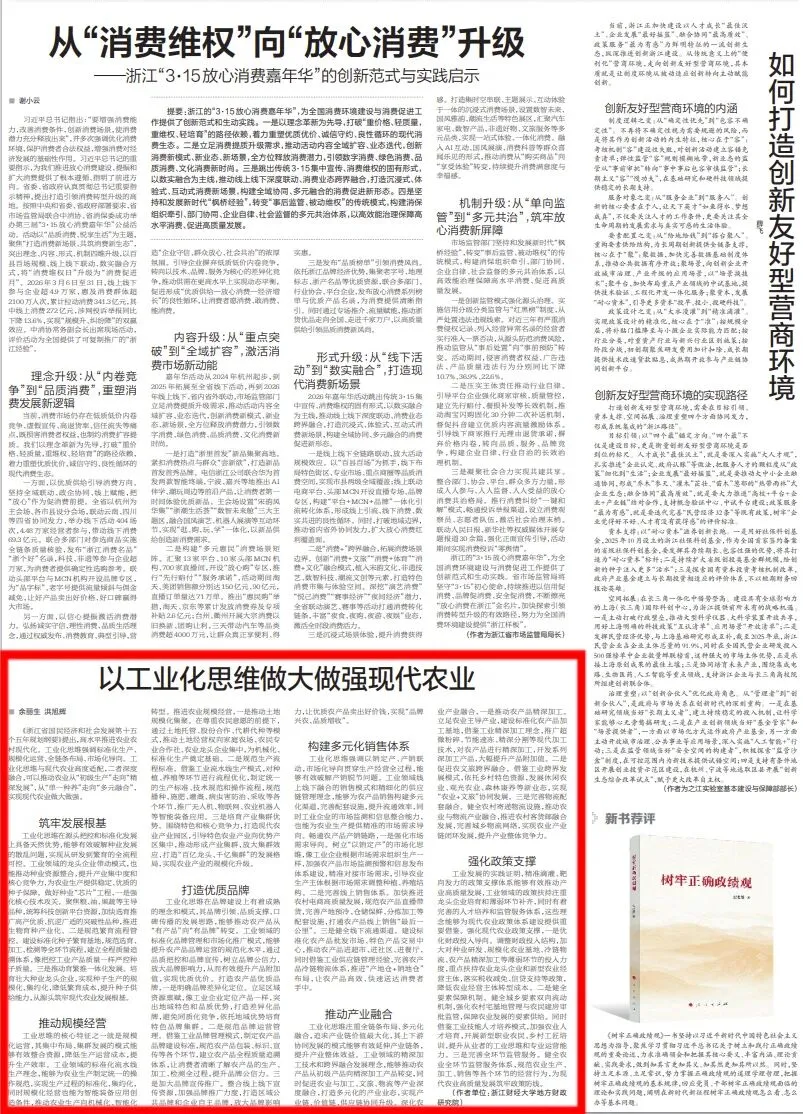由浙江财经大学财政地方研究院执行院长余丽生和洪旭辉撰写的《以工业化思维做大做强现代农业》在《浙江日报》2026年4月13日第七版刊发。全文内容如下: