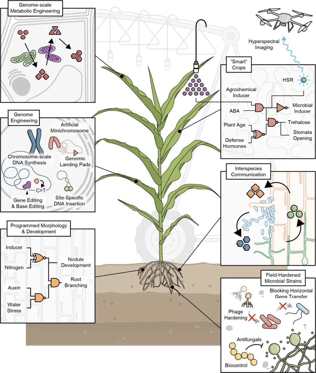 全球人口增长与气候危机下,农业需在有限土地上实现增产 50%,同时应对逆境胁迫、环境污染与资源短缺。传统育种与常规基因编辑技术存在核心瓶颈:作物优良性状难以精准堆叠、外源基因表达不可控、功能单一;微生物工程缺乏标准化设计,植物 - 微生物互作无法人工调控;现有技术无法实现环境自适应、多功能协同的农业系统构建,难以兼顾粮食安全、生态修复与低碳减排的多重目标。核心发现