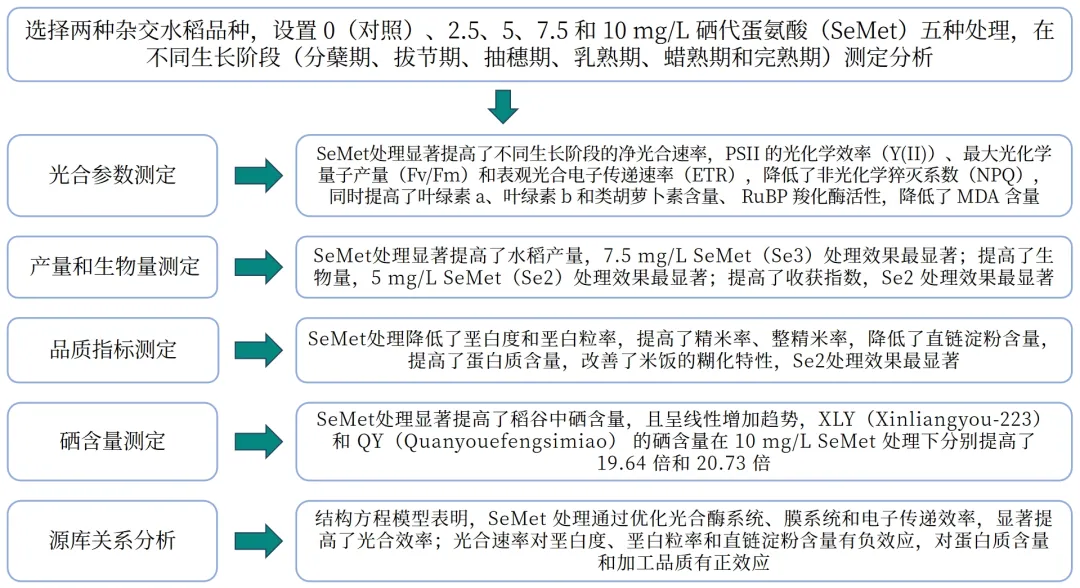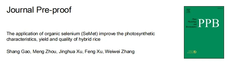 Gao, S., Zhou, M., Xu, J. et al.The application of organic selenium (SeMet) improve the photosynthetic characteristics, yield and quality of hybrid rice.Plant Physiology and Biochemistry.Volume 208,2024. https://doi.org/10.1016/j.plaphy.2024.108457.