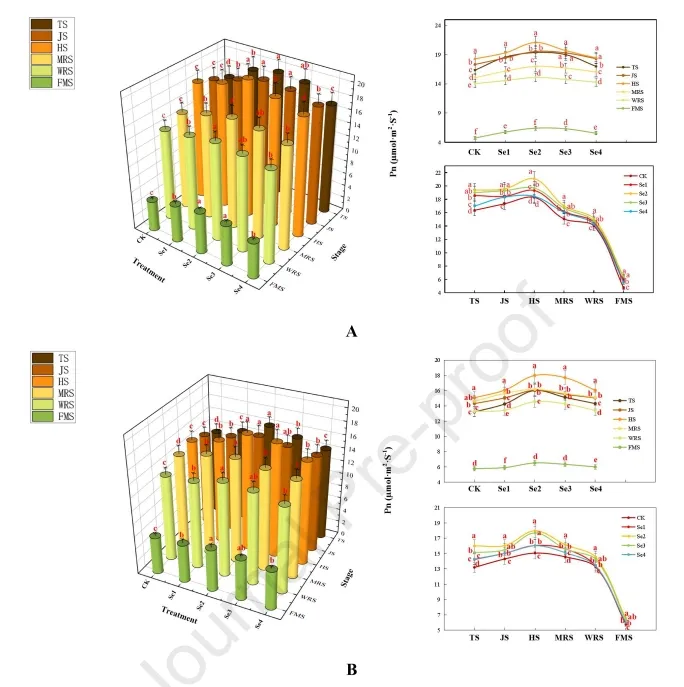 图1.(A-B)SeMet处理对XLY和QY不同生长阶段叶片的影响。注:数值为每个处理10个重复的平均值±标准偏差(SD)。不同小字母表示在P≤0.05时差异显著。TS:分蘖期;JS:拔节期;HS:抽穗期;MRS:乳熟期;WRS:蜡熟期;FMS:完全成熟期。XLY:Xinliangyou-223,QY:Quanyouefengsimiao,以下同。