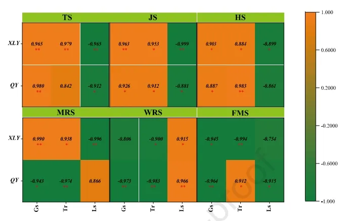 然后,我们分析了两个水稻品种各生长阶段气孔导度(Gs)、蒸腾速率(Tr)和气孔极限(Ls)和Pn之间的相关性(图2)。显然,从分蘖期(TS)到抽穗期(HS),两个品种的Pn与Gs和Tr呈正相关。同时,它与Ls呈负相关。但从乳熟期(MRS)开始,趋势发生了变化。在MRS中,XLY的Pn与Gs和Tr呈正相关,与Ls呈负相关。而QY的Pn则显示出相反的趋势。在蜡熟期(WRS)期间,XLY和QY的Pn与Gs和Tr呈负相关,与Ls呈正相关。然而,在FMS期间,XLY的Pn与Gs、Tr和Ls呈负相关。QY的Pn与Tr呈正相关,与Gs和Ls呈负相关。上述结果表明,这两个品种从TS到HS的Pn增加是由叶片气孔引起的。在MRS期间,XLY的Pn提高是由于叶片气孔,而QY则是由于非气孔因素。在WRS期间,两个品种的Pn均由非气孔因素引起。然而,在FMS期间,两个品种的Pn因子的增加是混乱的,这可能是由叶片老化引起的。