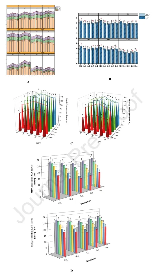 然后,我们还测定了叶片中RuBP酶的活性和丙二醛(MDA)的含量。如图3C所示,叶片中的RuBP酶活性明显受到SeMet处理的改善,其中Se2处理的改善最为显著。从TS到FMS,与CKs相比,对于XLY,Se2处理的RuBP酶活性分别提高了15.59%、17821.19%、13.28%、11.02%、22.86%和31.34%。QY的数值分别提高了14.84%、12.59%、16.55%、17.32%、18.10和33.33%。SeMet处理也能降低两个品种叶片中的MDA含量。与CK相比,经Se2处理的XLY叶片中MDA的含量从TS到FMS分别降低了32.09%、37.17%、27.06%、21.69%、12.32%和12.73%。QY值分别降低了19.27%、17.84%、14.82%、13.43%、12.27%和24.69%(图3D)。