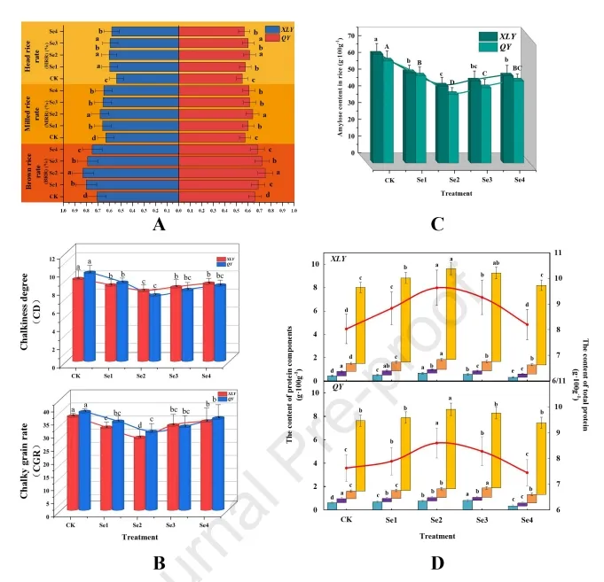此外,测定了经SeMet处理的大米中直链淀粉和蛋白质的含量及组成。从图4C中可以明显看出,SeMet显著降低了水稻的直链淀粉含量,而Se2处理对两个水稻品种的直链淀粉含量降低最为显著。与CK处理相比,XLY减少了29.2%,QY减少了32.8%。