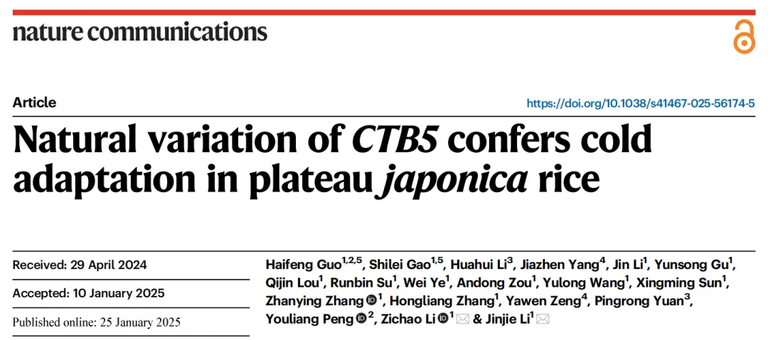 Guo, H., Gao, S., Li, H. et al. Natural variation of CTB5 confers cold adaptation in plateau japonica rice. Nature Communications 16, 1032 (2025). https://doi.org/10.1038/s41467-025-56174-5.