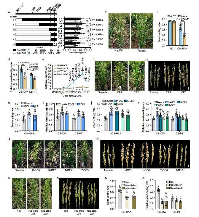图1.CTB5对孕穗期的抗寒性至关重要。(a)qCTB7的纯合重组体及其抗寒性能。数据代表平均值±标准差。在条形图上标明了用于表型的个体的数量(n)。(b)高海拔地区(CS-HAA)寒冷胁迫下NILCTB5和Towada的田间表现比较。(c、d)正常条件(NC)和CS-HAA条件下(c)以及深水(CS-DW)寒冷胁迫下和植物生长室(CS-PT)条件下(d)NILCTB5和Towada的结实率。数据代表平均值±标准差(NC和CS-HAA为n=15株植物,CS-DW和CS-PT为n=11株植物)。(e)NILCTB5和Towada在寒冷处理期间不同时间点的CTB5相对表达水平。数据代表平均值±SD(n=3个生物学重复)。(f、g)CS-HAA处理下Towada和CTB5互补系的田间表现(f)和穗(g)比较。比例尺g=2cm。(h、i)CS-HAA(n=20/18/18株)(h)CS-DW(n=15/15/10株)和CS-PT(n=15/15/15株)(i)下Towada和CTB5互补系的结实率。(j、k)CS-HAA(n=23/22/19/22/18株)(j)CS-DW(n=13/24/15/10/10株)和CS-PT(n=10/20/12/12/12株)(k)下Towada和CTB5过表达系的结实率。(l、m)CS-HAA胁迫下Towada和CTB5过表达系的田间表现(l)和穗(m)比较。比例尺m=2cm。(n)CS-HAA胁迫下Nipponbare和CTB5敲除系的田间表现(n)和穗(o)比较。比例尺o=2cm。(p、q)CS-HAA(n=15株植物)(p)CS-DW(n=10株植物)和CS-PT(n=10株植物)(q)下Nipponbare和CTB5敲除系的结实率。在(a、c-e)中,星号表示双尾Student’s t检验的统计学意义(**P<0.01,***P<0.001,数据代表平均值±标准差)。在(h–k,p、q)中,不同的小写字母表示通过Duncan多重范围检验的单因素方差分析在P=0.05处具有统计学显著差异,误差线表示平均值±标准差。