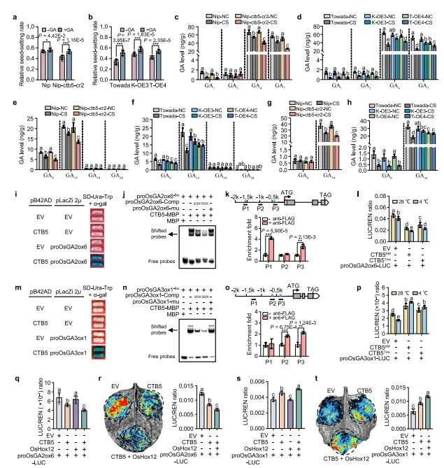 图2.CTB5通过直接调节OsGA2ox6和OsGA3ox1来调节花药中的赤霉素(GA)水平。(a、b)在施用和不施用GA的情况下暴露于冷胁迫的CTB5敲除(a)和过表达(b)植物的结实率。数据代表平均值±标准差(a中n=11/9、10/9株植物,b中n=10/10、10/10、7/7株植物)。(c-h)在正常条件(NC)和冷胁迫(CS)条件(16℃,7天)下CTB5敲除和过表达植物正在发育的花药中的GA含量。数据代表平均值±标准差(n=3个生物学重复)。(i、m)酵母单杂交试验测试CTB5与OsGA2ox6(i)和OsGA3ox1(m)启动子的结合。EV,空载体。(j、n)EMSA检测表明CTB5与OsGA2ox6(j)和OsGA3ox1(n)启动子的TAATTA基序结合。(k、o)ChIP-qPCR检测表明CTB5在体内与OsGA2ox6(k)和OsGA3ox1(o)启动子结合。数据代表平均值±标准差(n=3个生物学重复)。(l、p)双荧光素酶报告基因检测证实CTB5与水稻原生质体中的OsGA2ox6(l)和OsGA3ox1(p)启动子结合。EV,空pGreenII62-SK载体。数据代表平均值±标准差(l为n=5个生物学重复,p为n=4个生物学重复)。(q-t)双荧光素酶报告基因检测显示,OsHox12增强了CTB5对水稻原生质体(q,s)和烟草叶片(r,t)中OsGA2ox6和OsGA3ox1的调控作用。EV,空pGreenII62-SK载体。数据代表平均值±标准差(q和s的n=4个生物学重复,r和t的n=5个生物学重复)。在(i–t)中,显示了来自至少两个独立实验的代表性实验。在(a、b、k、o)中,星号表示通过双尾Student’s t检验的统计学显着性(*P<0.05,**P<0.01,***P<0.001)。在(c–h,l,p–t)中,不同的小写字母表示通过单因素方差分析和Duncan多范围检验在P=0.05处具有统计学显着差异。