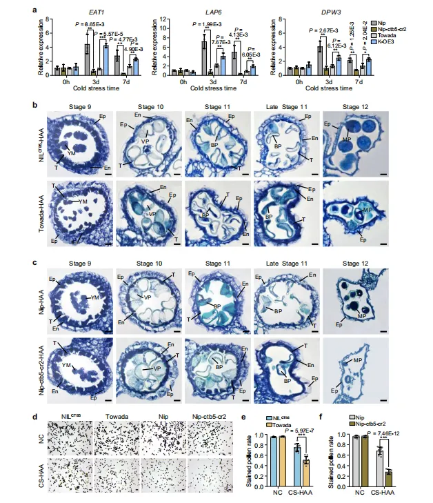 图3.CTB5在寒冷胁迫下调节绒毡层发育和花粉育性。(a)在正常和寒冷胁迫条件下,CTB5敲除和过表达系中EAT1、LAP6和DPW3的相对表达水平。数据代表平均值±标准差(n=3个生物学重复)。(b、c)在高海拔地区寒冷胁迫(CS-HAA)条件下,NILCTB5和Towada(b)以及Nipponbare和CTB5敲除植物(c)花药发育的组织学分析。比例尺=10μm。Ep,表皮细胞层;En,内皮细胞层;YM,小孢子;VP,液泡花粉;BP,双细胞花粉;MP,成熟花粉;T,绒毡层。(d)在正常条件(NC)和CS-HAA下对NILCTB5、Towada、Nipponbare和CTB5敲除植物的花粉进行染色。比例尺=100μm。(e、f)NC和CS-HAA条件下NILCTB5和Towada(e)以及Nipponbare和CTB5敲除植物(f)的染色花粉率。数据代表平均值±标准差(n=10个生物学重复)。在(a、e、f)中,星号表示双尾Student’s t检验的统计显著性(*P<0.05,**P<0.01,***P<0.001)。
