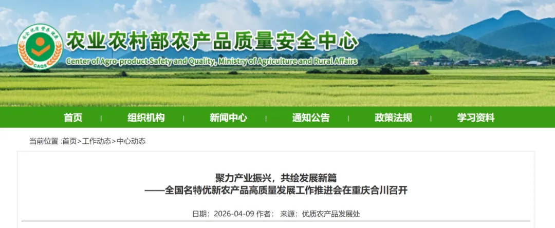 4月8日,全国名特优新农产品高质量发展工作推进会在重庆合川召开。会议旨在系统总结全国名特优新农产品发展“十四五”时期工作成效,全面部署“十五五”开局之年重点任务,推动全国名特优新农产品从“产品认定”向“产业振兴”深化。农业农村部农产品质量安全监管司二级巡视员李家健、农业农村部农产品质量安全中心副主任王子强出席会议并讲话。各省级农产品质量安全(优质农产品)工作机构、部分全国名特优新农产品营养品质评价鉴定机构负责同志参加会议。