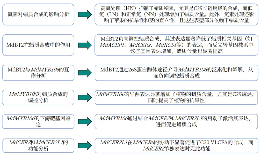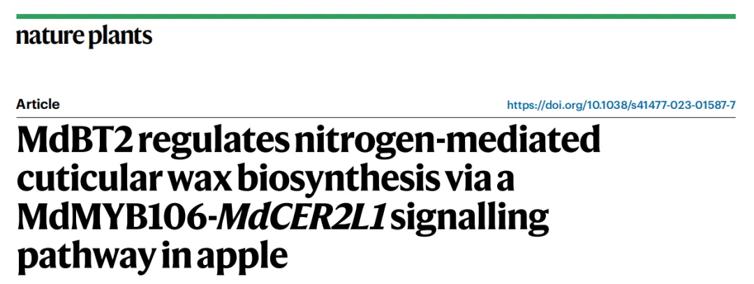 Han,J.,et al(2024).MdBT2 regulates nitrogen-mediated cuticular wax biosynthesis via aMdMYB106-MdCER2L1 signalling pathway in apple.Nature Plants.https://doi.org/10.1038/s41477-023-01587-7
