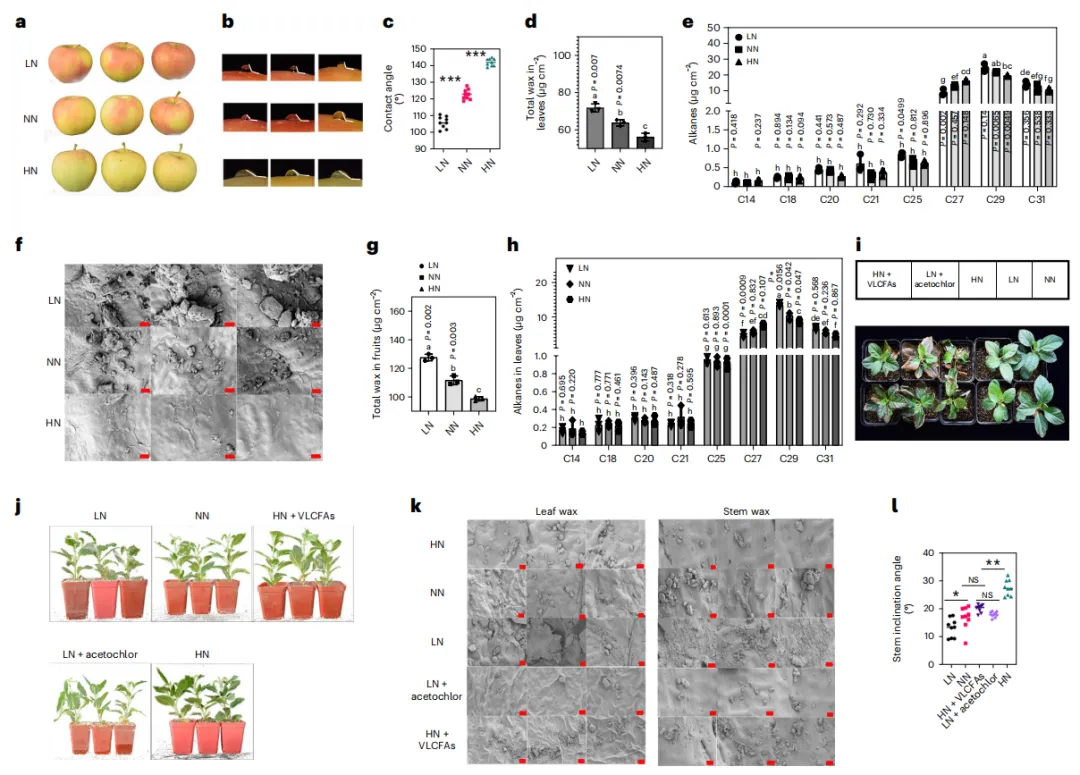 图1.N负向调控苹果蜡质的积累。(a)用HN、NN和LN浓度处理的苹果果实表型。(b,c)用不同N浓度处理的水果表面与水滴之间的接触角的照片(b)和测量值(c)。(d,e)用不同N浓度处理的果实的总蜡负荷(d)和烷烃(e)。(f)用不同N浓度处理的叶片蜡质晶体的SEM图像。Bar,2μm。(g,h)用不同N浓度处理的叶片的总蜡负荷(g)和烷烃(h)。(i)HN、NN、LN、LN与乙草胺以及HN与VLCFA混合物处理对苹果幼苗干旱程度的影响。(j)HN、NN、LN、LN与乙草胺以及HN与VLCFA混合物处理对苹果幼苗直立程度的影响。(k)HN、NN、LN、含乙草胺的LN和含VLCFA混合物的HN处理的叶片和茎蜡质晶体的SEM图像。Bar,10μm。(l)茎倾斜角的定量统计。*表示通过Student’s t检验(双侧)评估的显著差异。***P<0.001;**P<0.01;*P<0.05;NS,不显著。对于条形图,通过单因素方差分析(使用Tukey检验)评估,不同字母表示具有显著差异(P<0.01)。