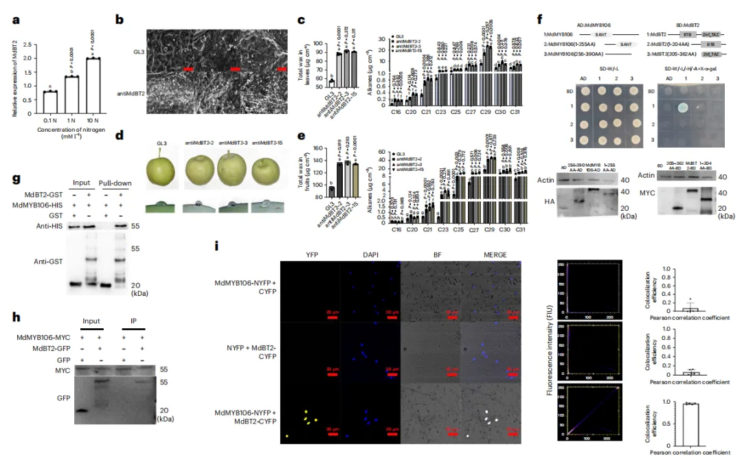 图2.MdBT2在体内和体外通过与MdMYB106相互作用对蜡质生物合成产生负面影响。(a)不同氮供应下MdBT2的相对表达水平。(b)GL3和antiMdBT2叶片蜡质晶体的SEM图像。Bar,50μm。(c)GL3和antiMdBT2叶片的总蜡负荷和烷烃。(d)GL3和antiMdBT2果实的水滴分析。(e)GL3和antiMdBT2果实的总蜡负荷和烷烃。(f)分段Y2H分析以验证MdBT2和MdMYB106之间的相互作用,并采用蛋白质印迹分析来验证每个菌株中的蛋白质表达。(g)体外用MdBT2-GST和MdMYB106-His进行下拉实验。(h)体内Co-IP试验验证MdBT2和MdMYB106与Anti-GFP和Anti-MYC抗体之间的相互作用。(i)体内BiFC试验测试MdMYB106与MdBT2之间的相互作用。然后,使用4′,6-二脒基-2-苯基吲哚(DAPI)作为核标记。YFP,黄色荧光蛋白;BF,明场;MERGE,YFP、DAPI和BF的合并视图。(f-h)中的实验至少独立重复了三次,结果相似。对于条形图,通过单因素方差分析(使用Tukey检验)评估,不同字母表示具有显著差异(P<0.01)。