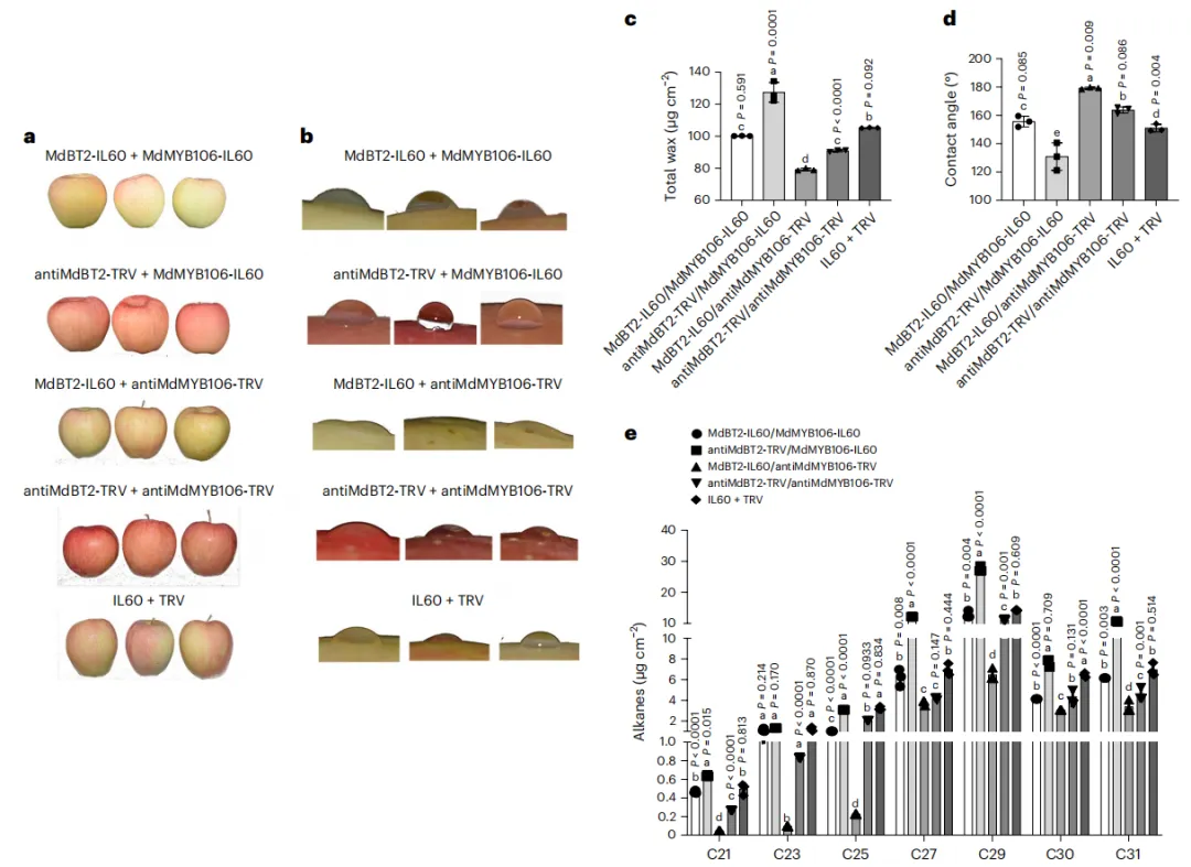 我们利用病毒诱导的基因沉默方法测试了MdBT2和MdMYB106在调节蜡质积累中的作用。表型结果表明MdBT2是花青素积累的负调节剂(图3a)。总蜡质含量和水滴分析表明,MdBT2-IL60 + MdMYB106-TRV果实的总蜡质含量最低,水滴与果实表面的接触角最大。相反,antiMdBT2-TRV + MdMYB106-IL60果实的总蜡质含量最高,接触角最小(图3b-d)。C27、C29和C31烷烃是antiMdBT2-TRV + MdMYB106-IL60果实中增加最明显的组分(图3e),与antiMdBT2转基因苹果叶片的结果一致(图2e)。