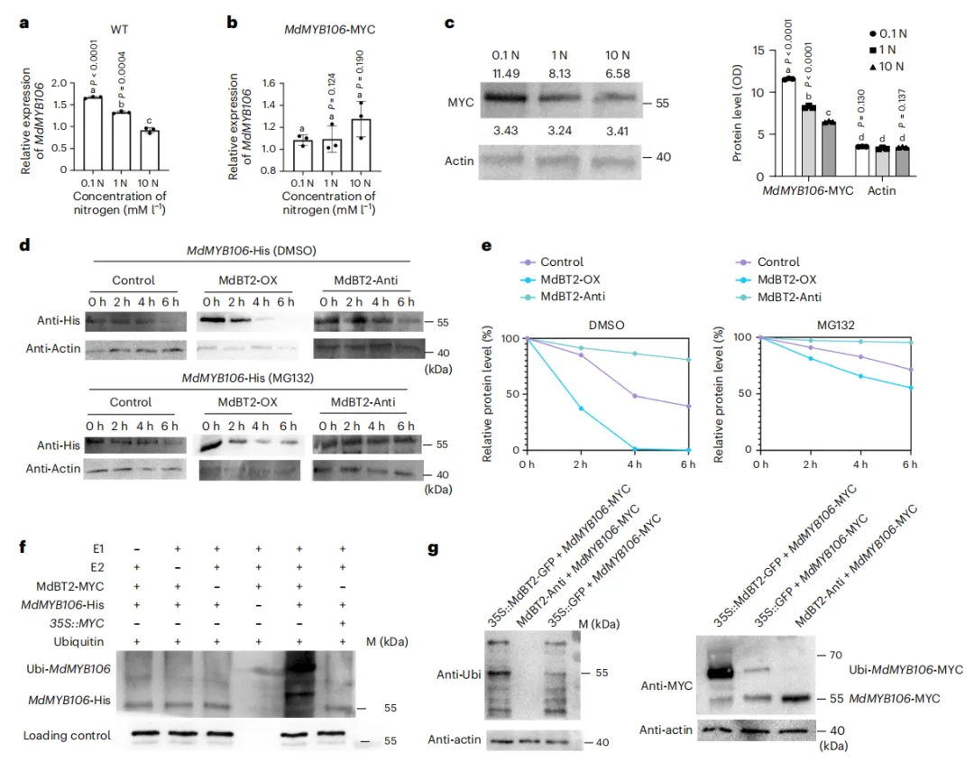 图4.MdBT2通过26S蛋白酶体途径介导MdMYB106的泛素化和降解。(a)不同氮浓度下WT中MdMYB106的相对表达水平。(b)不同氮浓度下35S::MdMYB106-MYC的相对表达水平。(c)N处理下MdMYB106的蛋白质水平。(d)转基因苹果愈伤组织蛋白提取物中MdMYB106-His蛋白的无细胞降解测定。将从MdBT2-OX(过表达)、对照和MdBT2-Anti愈伤组织中提取的蛋白质与MdMYB106-His蛋白孵育指定时间。用抗His抗体检测MdMYB106的水平。(e,d)中MdMYB106蛋白水平的量化。(f)半体内分析显示MdBT2参与了MdMYB106的泛素化。从35S::MdBT2-MYC和35S::MYC苹果愈伤组织中提取总蛋白,并将100μg兔E1、100ng人E2、1 ng泛素和MdMYB106-His添加到蛋白提取物中。用抗His抗体检测混合物。g,使用抗MYC抗体和抗Ubi抗体进行体内泛素化试验,以检测MdBT2介导的MdMYB106蛋白泛素化。c、d、f和g中的实验至少独立重复三次,结果相似。对于条形图,通过单因素方差分析(使用Tukey检验)评估,不同字母表示具有显著差异(P<0.01)。