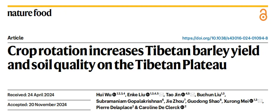 Wu, H., Liu, E., Jin, T. et al. Croprotation increases Tibetan barley yield and soil quality on the Tibetan Plateau. Nat Food (2025). https://doi.org/10.1038/s43016-024-01094-8.