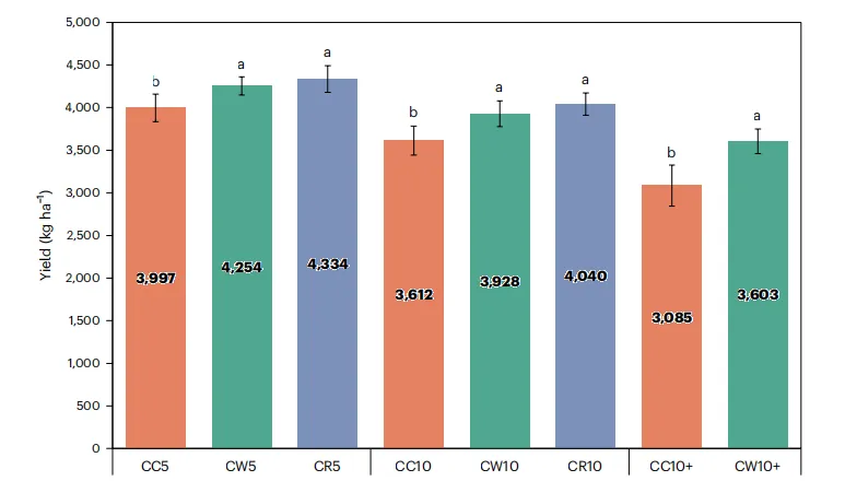 图1.西藏青稞长期连作和轮作的平均产量。在CC5、CW5、CR5、CC10、CW10、CR10、CC10+、CW10+中,橙色代表CC,绿色代表CW,紫色代表CR。每种处理均使用生物学重复。数据以平均值±标准偏差表示。经邓肯多重比较分析计算,不同字母表示藏青稞产量之间存在显著差异。