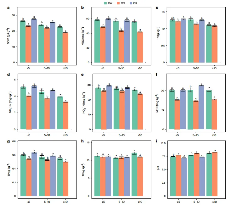 图2.西藏青稞连作和轮作不同年份的SOM、MBC、TN、NH4+ -N、NO3- -N、MBN、TP、TK和pH的差异。橙色代表CC,绿色代表CW,紫色代表CR。CC处理:≤5,小于或等于5年;5-10,5-10年;≥10,大于或等于10年。在CC5、CW5、CR5、CC10、CW10、CR10、CC10+、CW10+中分别有n=24、n=15、n=18、n=15、n=9、n=9、n=18、n=9。每种处理均使用生物学重复。数据以平均值±标准误差表示。经邓肯多重比较分析计算,不同字母表示藏青稞产量之间存在显著差异。