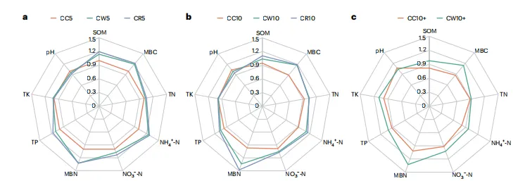 SQI可用来衡量土壤退化程度和土壤健康状况。我们分析了不同连作年和轮作年的SQI。随着青稞连作年限的增加,SQI呈下降趋势,青稞连作CC5年和CC10+年的SQI下降趋势高于CC10年。CC5、CC10和CC10+的SQI分别为1.00、0.93和0.87。藏青稞与小麦和油菜长期轮作的SQI明显低于短期轮作的SQI。如果考虑同一种植年度,藏青稞连作的SQI在三个种植期的三种种植模式中最低。CR5和CR10的SQI高于CW5和CW10(图3a,b)。CW10+的SQI明显高于CC10+(图3c)。CW10+和CR10的SQI面积与CC5面积之比分别为1.15和1.21。从CC5到CC10范围内的SQI比从CC10到CC10+范围内的SQI下降得更快。CC的SQI下降速度快于CW和CR。
