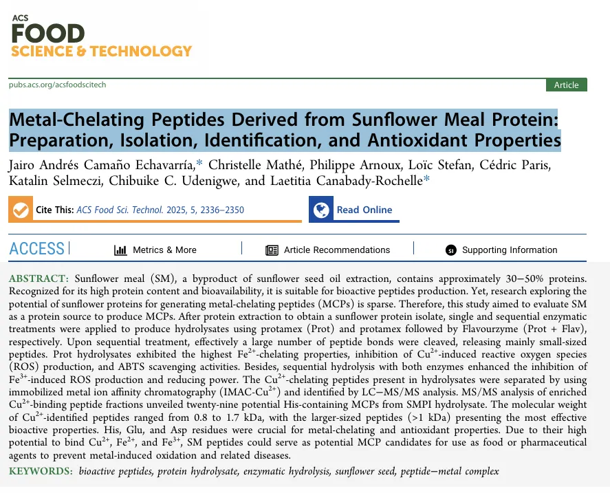 Laetitia Canabady-Rochelle 研究团队系统评估了以向日葵粕为原料制备金属螯合肽的工艺,并对其活性进行了深入表征。该工作聚焦于酶解产物的金属螯合能力及相关抗氧化活性,为开发基于农业副产物的天然抗氧化剂提供了科学依据。