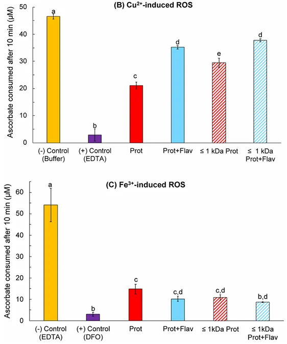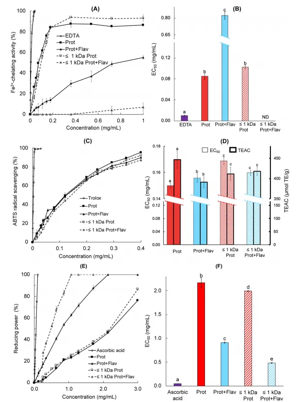 进一步研究发现,Protamex 单酶水解物展现出最强的 Fe²⁺ 螯合活性,其半数有效浓度(EC50)显著低于顺序水解产物。同时,其在抑制 Cu²⁺ 诱导的 ROS 生成以及清除 ABTS 自由基方面也具有最高活性。这提示过度水解可能破坏了对活性至关重要的肽段结构或关键氨基酸微环境。