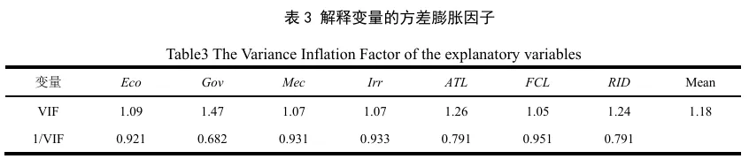 在进行正式回归分析之前,本文对所有使用变量进行多重共线性检验(表3)。检验结果中解释变量的方差膨胀因子显示,所有变量中方差膨胀因子(VIF)远小于经验法则所要求的临界值10,可以认为变量之间多重共线性较低,通过多重共线性检验。