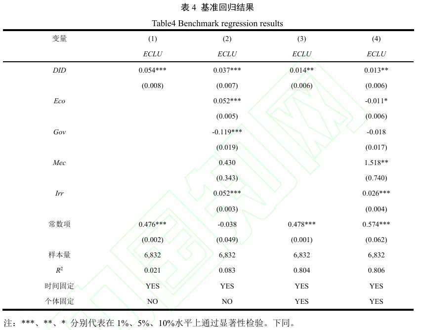 本文在DID的基础上,采用双向固定模型进行基准回归,通过控制时间固定效应和个体固定效应,得到基准回归结果(表4)。固定效应模型分为4个步骤进行:列(1)呈现的是仅控制时间固定效应,尚未加入任何控制变量时的回归结果,此步骤旨在初步观察时间因素对耕地利用生态效率的基础影响;列(2)的回归结果是在列(1)的基础之上,进一步加入了控制变量;列(3)为同时控制时间固定效应和个体固定效应,但未加入控制变量的回归结果;列(4)的回归结果是在列(3)的基础上,加入了控制变量。由基准回归结果可知,所有被解释变量的政策交乘项均对耕地利用生态效率有显著的促进效应,因此假说1得到证实,即农业绿色发展先行区政策能促进耕地利用生态效率提升。