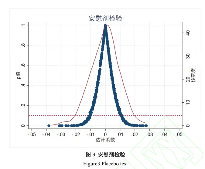 (2)城市安慰剂检验。借鉴Cai等的做法,从样本中随机挑选65个地区作为虚假的处理组,可以得到实施安慰剂的县(市、区)对耕地利用生态效率影响的系数估计值和对应p值,将上述过程重复500次后得到的安慰剂检验图(图3)。虚假回归系数若由不可观测因素主导,会在分布上呈现出较为集中的特征,大多围绕0值附近分布,远离0值的高尾区域出现的概率极低。而我们得到的基准回归系数估计值0.013却处于这一高尾位置,因此表明本文的基准回归结果并非是不可观测因素所导致的。