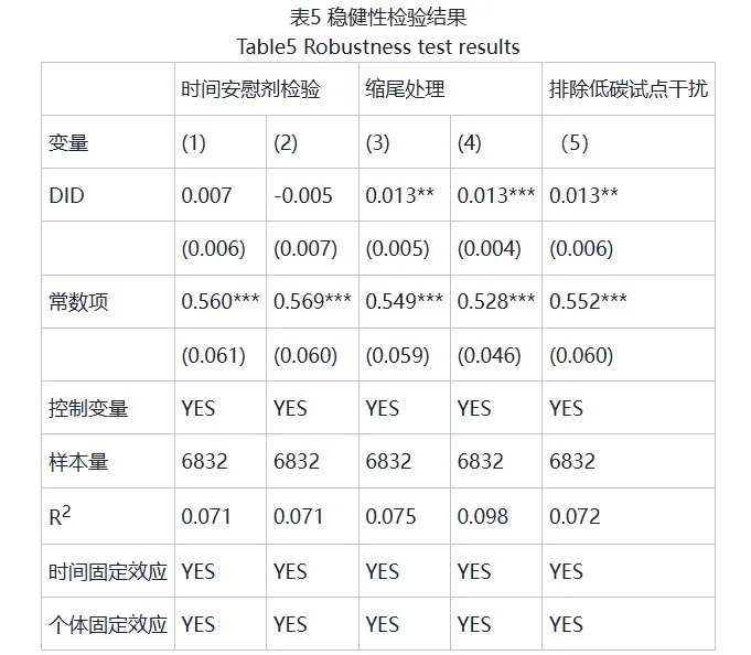 为了防止样本期间其他政策举措对耕地利用生态效率产生影响,进而导致基准回归结果出现偏差,本研究通过收集和梳理文件,发现低碳城市试点的建立能减污降碳,促进生态效率,且第三批低碳城市试点于2017年建立,因此可能影响样本期间耕地利用生态效率。为避免农业绿色发展先行区政策实施期间因为低碳城市试点的建立所带来的干扰,加入低碳试点政策的虚拟变量,结果如表5的列(5)所示,其回归结果与基准回归结果一致,再次证明了农业绿色发展先行区政策的建立能促进耕地利用生态效率。