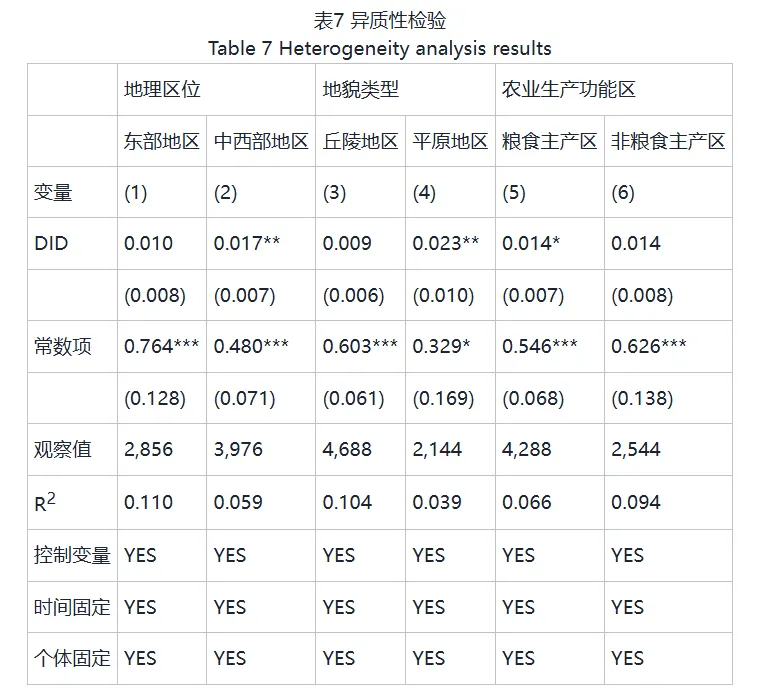为揭示农业绿色发展先行区政策的地貌异质性特征,本文基于地形梯度将研究区域划分为丘陵和平原两大类型单元。表7的列(3)和列(4)的回归结果显示,政策对耕地利用生态效率的促进作用呈现显著空间分异特征:平原地区政策效应系数达0.023(p<0.05),而丘陵地区未通过显著性检验。平原地区因其地势平坦、田块连片的优势,更易形成规模化经营与技术集约投入的良性循环。在政策驱动下农业生产可以采用更先进的设备和技术,实现专业化分工,从而降低生产成本、提高生产效率,获取规模经济效益。且这种优越的地形条件为农业的多元化发展提供了得天独厚的基础,有利于打造功能复合型的现代农业形态,从而促进耕地利用生态效率提升。而丘陵地区地形复杂、土地细碎化和生态脆弱性等,难以形成大规模的集中种植区域,实现规模经济,因此政策效应对于丘陵地区耕地利用生态效率的促进作用有限。