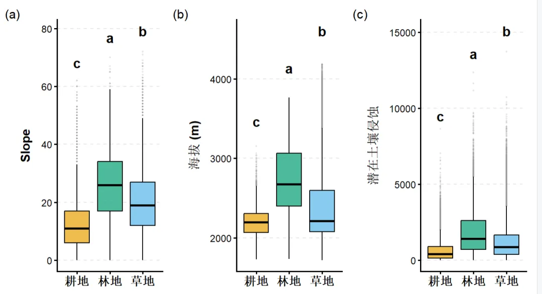 # 终极版通用绘图函数# 终极版通用绘图函数 (已修复 NA 报错)# 不进行对数转换的绘图函数plot_academic_box_linear <- function(data, y_var, y_label) { clean_data <- data %>% filter(!is.na(.data[[y_var]]) & !is.na(Landuse)) sig_data <- get_sig_letters(clean_data, y_var) ggplot(clean_data, aes(x = Landuse, y = .data[[y_var]], fill = Landuse)) + geom_boxplot(alpha = 0.7, outlier.size = 0.5, outlier.alpha = 0.2, outlier.color = "grey60", linewidth = 0.6, color = "black") + scale_fill_manual(values = my_colors) + # 删除了 scale_y_log10() 模块,恢复默认线性坐标轴 # 注意:因为没有了 log10 的压缩,显著性字母的 Y 轴高度位置需要略微调低 # 这里从乘以 1.5 改为乘以 1.1,避免字母飞得太高 geom_text(data = sig_data, aes(x = Landuse, y = Max_Value * 1.1, label = Letter), size = 5, fontface = "bold", color = "black", inherit.aes = FALSE) + labs(x = NULL, y = y_label) + theme_classic() + theme( legend.position = "none", axis.text.x = element_text(size = 12, face = "bold", color = "black"), axis.text.y = element_text(size = 10, color = "black"), axis.title.y = element_text(size = 13, face = "bold", margin = margin(r = 10)), axis.line = element_line(linewidth = 0.8, color = "black"), axis.ticks = element_line(linewidth = 0.8, color = "black"), panel.grid.major.y = element_line(color = "grey90", linetype = "dashed") )}# 使用新函数出图p1_linear <- plot_academic_box_linear(df_ready, "Slope", "Slope")p2_linear <- plot_academic_box_linear(df_ready, "Elevation", "海拔 (m)")p3_linear <- plot_academic_box_linear(df_ready, "Qsep", "潜在土壤侵蚀")# 纯粹合并并添加默认标签,不强行嵌套 theme 修改combined_plot_linear <- (p1_linear | p2_linear | p3_linear) + plot_annotation( tag_levels = 'a', tag_prefix = '(', tag_suffix = ')' )# 打印查看(此时控制台会干干净净)print(combined_plot_linear)