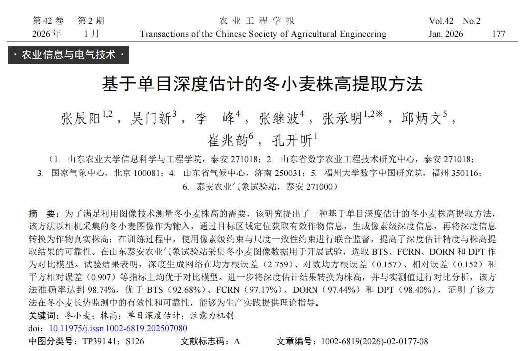 《农业工程学报》2026年第42卷第2期刊载了山东农业大学等单位张辰阳、吴门新、李峰、张继波、张承明、邱炳文、崔兆韵与孔开昕的论文——“基于单目深度估计的冬小麦株高提取方法”。该研究由风云卫星应用先行计划(三期)项目(项目号:FY-APP-2024.0301)等资助。