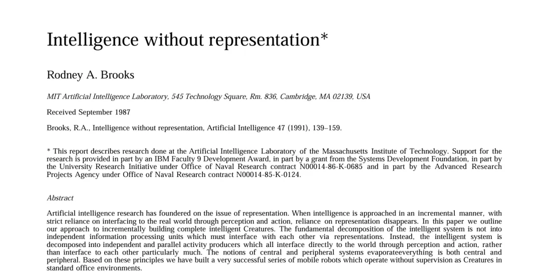 而在机器人领域,真正让“具身”从思想变成方法论的人,通常被认为是罗德尼·布鲁克斯。他在《Intelligence without representation》等工作中明确反对当时主流的“先建模、再推理、后行动”的人工智能路线,转而强调机器人应直接依靠感知—动作回路,在真实环境中实时响应。