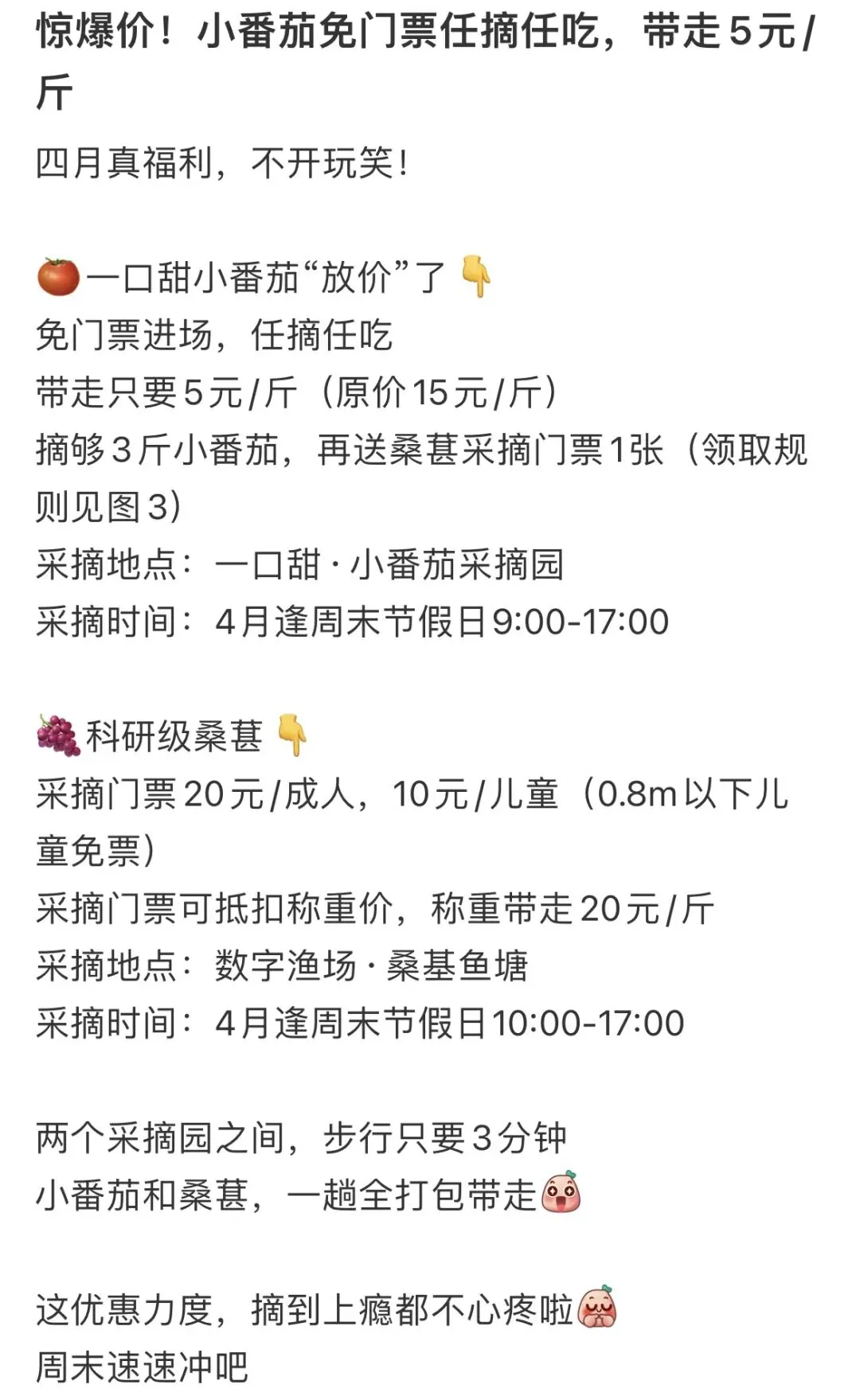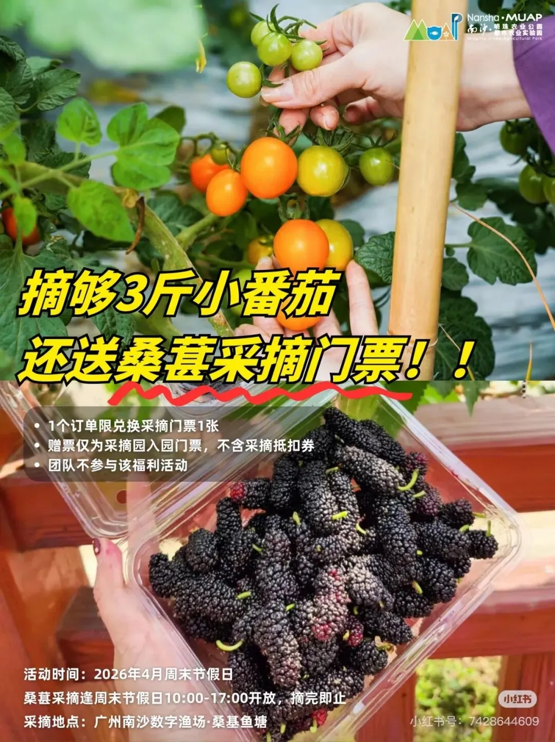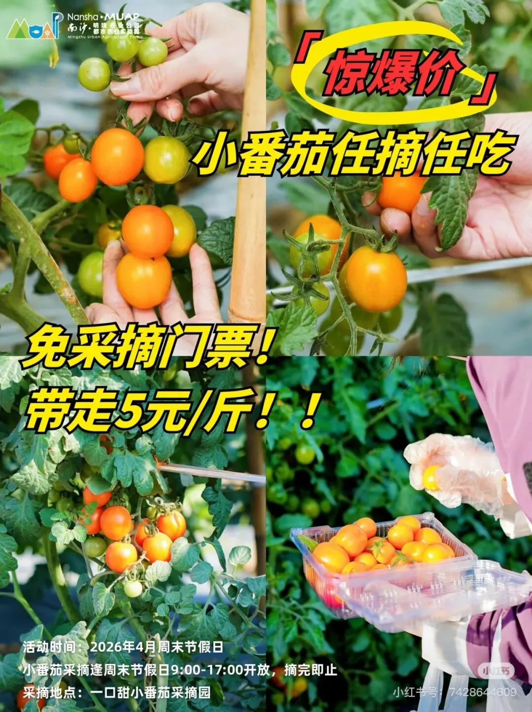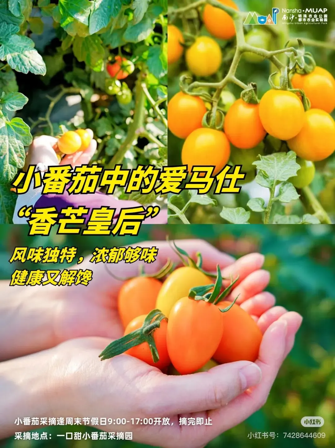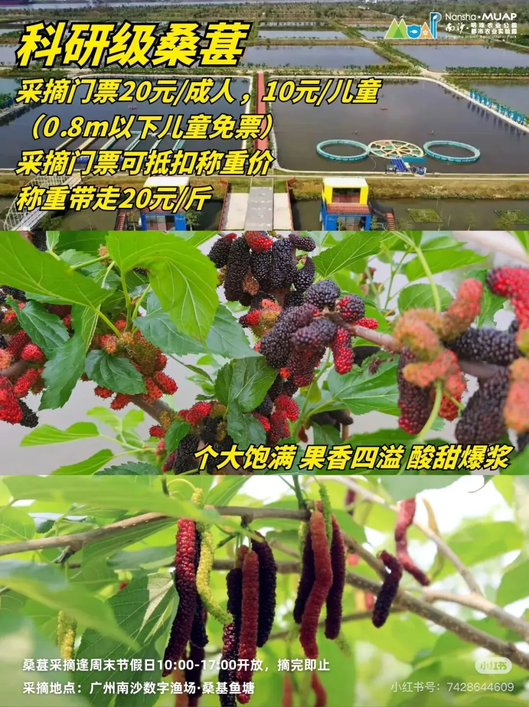 最近,南沙助农火遍全网,各个镇的甘蔗,番石榴,番薯,番茄,青瓜,包菜,芹菜等等滞销农产品在广大博主的推广和网友们的组团下,迎来了市场旺季。这不,趁着这波流量,南沙明珠农业园也搞起来了活动。以下图片来自小红书博主南沙明珠农业园。还没到采摘园入口,路口就停满了车。我滴乖乖,大家的消息都这么灵通吗?据悉,小番茄采摘价5元/斤是从上周末开始调的,之前都是卖10-15元/斤呢。因为赶上了第一波降价,园里人来人往,好不热闹。再看看小番茄,黄橙橙,红彤彤的,让人忍不住想摘下来尝尝。因为官方博文备注了可以任摘任吃,那还等什么,赶紧尝一尝吧。嗯...怎么说呢,黄色的小番茄甜中带酸,开胃;橙色的好像更甜一点,但由于人多,不容易挑到。好吧,那就不挑了,黄橙色一起摘,带娃来体验采摘嘛,开心就好。摘了黄色的摘红色的,为什么我们先不摘红色的呢,因为红色的上午不开放。尝了红色的小番茄,我有点后悔黄色的摘多了。红色的确实更好吃,就是那种我们平常见的千禧小番茄,口感真的是太好了,甜度高,偶尔有些带点酸,但整体的甜度比黄色的高太多了。大家要去摘的话,可以先两种都尝一尝,再按个人喜好确定每种番茄的采摘数量。入桑葚园的桥两边种满了桑葚,基本园内的品种都聚集了,而且特别多奶油色的桑葚,具体学名叫啥,咱也不知道,只听路人说是奶油桑葚。这种桑葚吃起来很清甜,有种奶油滑滑的细腻的口感,难怪大伙叫它奶油桑葚。这种桑葚在入口处桥的两边都有,大家去摘的时候留意一下。如果这边的找不到成熟的,可以往里面走,走到桥的尽头,然后左转,沿着那个沙路一直走到倒数第二条塘基,那条塘基两边都是这种桑葚。这种紫黑色的毛毛虫桑葚有着浓郁的甜味,好好吃,但吃的时候需要克服心理障碍。如果是粉紫色,则是酸甜味道,适合解腻。这里的桑葚品种真的好多,因为以上这两种比较特别,也比较好吃,所以只摘了这两种带回家。当然,你可以免费尝遍整个园区的桑葚品种,如果时间充裕的话。另外,计划去摘桑葚的时候记得备好手套,我们没准备,手都变成紫黑色了,如果不介意也可以不准备;另外建议穿深颜色的衣服和裤子。好啦,这次的亲子游采摘活动就介绍到这里了,期待下次有更好玩的采摘活动。
