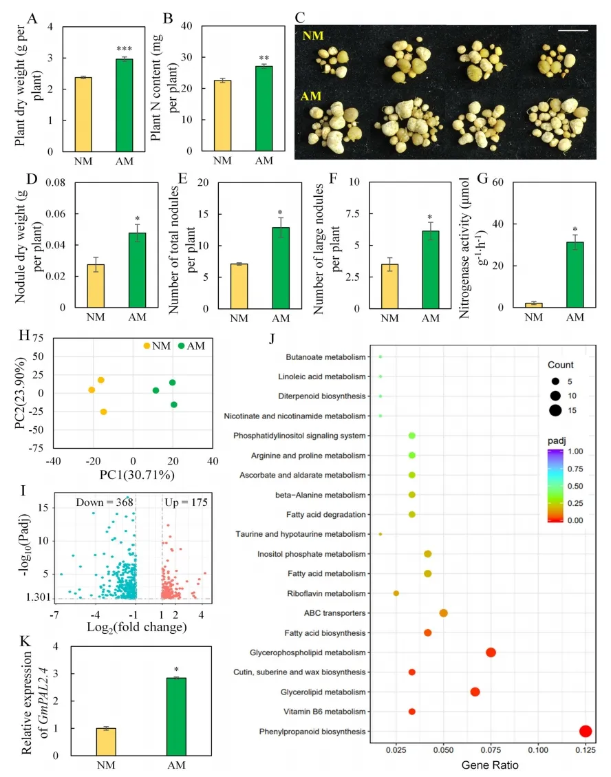 图1. 菌根接种对大豆植株生长、结瘤特性的影响和转录组分析。(A)植物干重。(B)植物氮(N)含量。(C)根瘤生长。白色刻度尺=1cm。(D)根瘤干重。(E)每株植物的根瘤总数。(F)每株植物的大根瘤数量。(G)固氮酶活性。在A-G中,数据是具有标准误差的四次重复的平均值。星号表示非菌根(NM)和菌根(AM)接种处理之间存在的显著差异(Student’s t检验,*p<0.05,**p<0.01,***p<0.001)。(H)主成分分析(PCA)。(I)显示上调和下调基因的火山图。红点代表上调的基因,蓝点代表下调的基因。(J)KEGG富集气泡图。纵坐标表示富集途径,横坐标表示基因比率。每个点的大小表示路径中DEGs的数量,点的颜色表示调整后的p值。p≤0.05的KEGG通路被认为是显著富集。(K)GmPAL2.4的相对表达量。qRT-PCR分析中包括四个生物重复。星号表示NM和AM处理之间存在显著差异(Student's t检验,*p<0.05)。