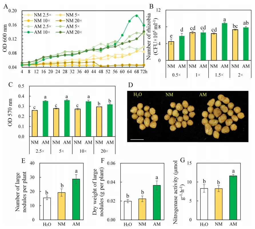 图2. 未接种(NM)和接种丛枝菌根(AM)的大豆根系分泌物对根瘤菌生长、趋化性、生物膜形成和结瘤的影响。(A)根瘤菌生长。数据计算为1至72h的培养物光密度(OD)减去根瘤菌液体培养物的初始OD。(B)根瘤菌趋化性。(C)根瘤菌生物膜形成。(D)根瘤生长。白色刻度尺=1cm。(E)每株植物的大根瘤数量。(F)大根瘤的干重。(G)固氮酶活性。在B、C、E-G中,数据是具有标准误差的四次重复的平均值。通过邓肯多重范围检验,具有相同字母的条形图在不同处理之间没有显著差异(p<0.05)。