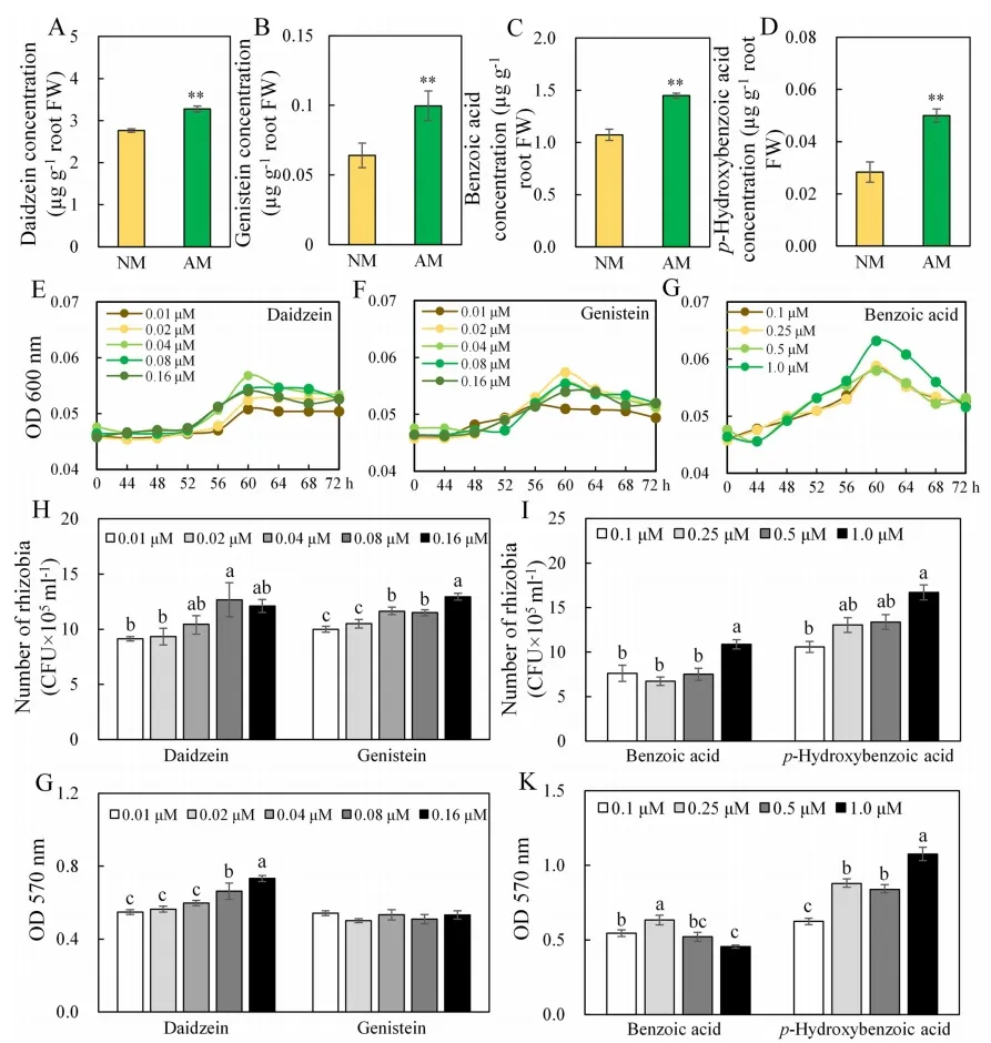 图3. 未接种(NM)和接种丛枝菌根(AM)的大豆根系分泌物中大豆苷元、染料木素、苯甲酸和对羟基苯甲酸的浓度,以及它们的添加对根瘤菌生长、趋化性和生物膜形成的影响。(A)大豆苷元浓度。(B)染料木素浓度。(C)苯甲酸浓度。(D)对羟基苯甲酸浓度。在A-D中,数据是四个具有标准误差的重复的平均值。星号表示NM和AM处理之间存在显著差异(Student's t检验,**p<0.01)。(E)添加大豆苷元的根瘤菌生长。(F)添加染料木素的根瘤菌生长。(G)添加苯甲酸的根瘤菌生长。数据计算为1-72h的培养物OD减去根瘤菌液体培养物的初始OD。(H)添加黄酮类化合物的根瘤菌趋化性。(I)添加酚酸的根瘤菌趋化性。(G)添加黄酮后根瘤菌生物膜的形成。(K)添加酚酸形成根瘤菌生物膜。在H-K中,数据是具有标准误差的四次重复的平均值。通过邓肯多重极差检验,同一化合物中具有相同字母的条形图在浓度上没有显著差异(p<0.05)。