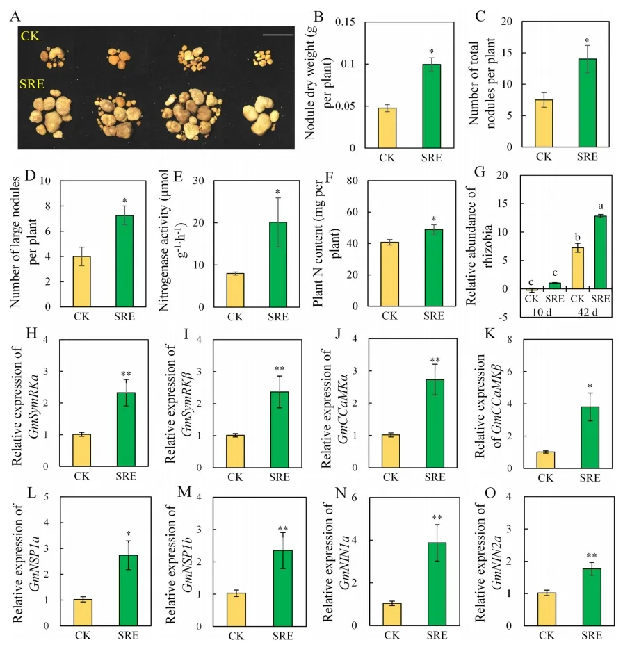 图4. 合成根系分泌物(SRE)对土壤栽培大豆结瘤固氮及共生相关基因表达的影响。(A)根瘤生长性能。白色刻度尺=1cm。(B)根瘤干重。(C)每株植物的根瘤总数。(D)每株植物的大根瘤数量。(E)固氮酶活性。(F)植物氮(N)含量。(G)根瘤菌的相对丰度。(H)GmSymRKα的相对表达量。(I)GmSymRKβ的相对表达量。(J)GmCCaMKα的相对表达量。(K)GmCCaMKβ的相对表达量。(L)GmNSP1a的相对表达量。(M)GmNSP1b的相对表达量。(N)GmNIN1a的相对表达量。(O)GmNIN2a的相对表达量。数据是四次重复的平均值,有标准误差。在B-F、H-O中,星号表示CK和SRE处理之间存在显著差异(Student's t检验,*p<0.05,**p<0.01)。在G中,通过邓肯多重检验,不同处理之间具有相同字母的条形图没有显著差异(p<0.05)。