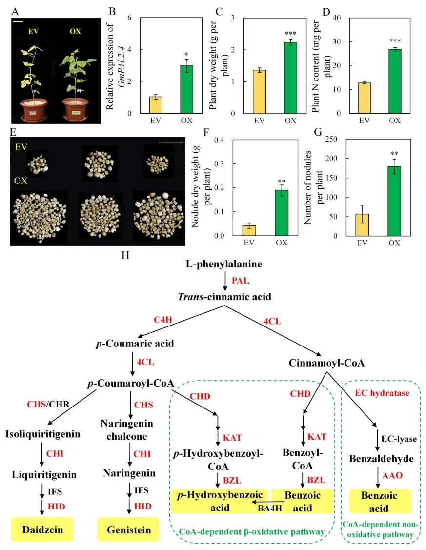 图5. 过表达GmPAL2.4对植物生长、结瘤特性以及黄酮(大豆苷元和染料木素)和酚酸(苯甲酸和对羟基苯甲酸)生物合成途径中关键基因表达的影响。(A)植物生长性能。白色刻度尺=10cm(B)GmPAL2.4的相对表达量。(C)植物干重。(D)植物氮(N)含量。(E)根瘤生长。白色刻度尺=2cm。(F)根瘤干重。(G)每株植物的根瘤数。在B-D、F、G中,数据是具有标准误差的四次重复的平均值。星号表示空载体(EV)和过表达(OX)大豆品系之间存在显著差异(Student's t检验,*p< 0.05,**p<0.01,***p <0.001)。(H)特定黄酮类化合物(大豆苷元和染料木素)和酚酸(苯甲酸和对羟基苯甲酸)生物合成示意图。DEGs用红色标记。PAL,苯丙氨酸解氨酶;C4H,肉桂酸-4-羟化酶;4CL,4-香豆素-CoA连接酶;CHS,查尔酮合酶;CHR,查尔酮还原酶;CHI,查尔酮异构酶;IFS,异黄酮合酶;HID,2-羟基异黄酮脱水酶;CHD,肉桂酰辅酶A水合酶/肉桂酰辅酶A脱水酶;KAT,3-酮酰基-CoA硫解酶;BZL,苯甲酰辅酶A连接酶;EC水合酶、烯酰辅酶A水合酶;EC裂解酶,烯酰辅酶A;AAO,醛氧化酶;BA4H,苯甲酸4-羟化酶。