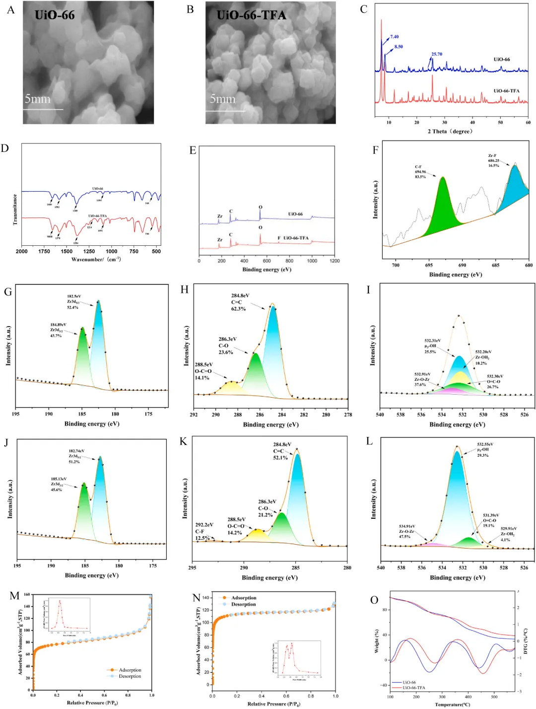 TFA 修饰后,UiO-66-TFA 呈现更规则的八面体形貌和更高的结晶度。FT-IR 在 1214 cm⁻¹ 出现 C-F 特征峰,XPS 检测到明显 F 1s 峰(688–690 eV),证实 TFA 成功引入。
